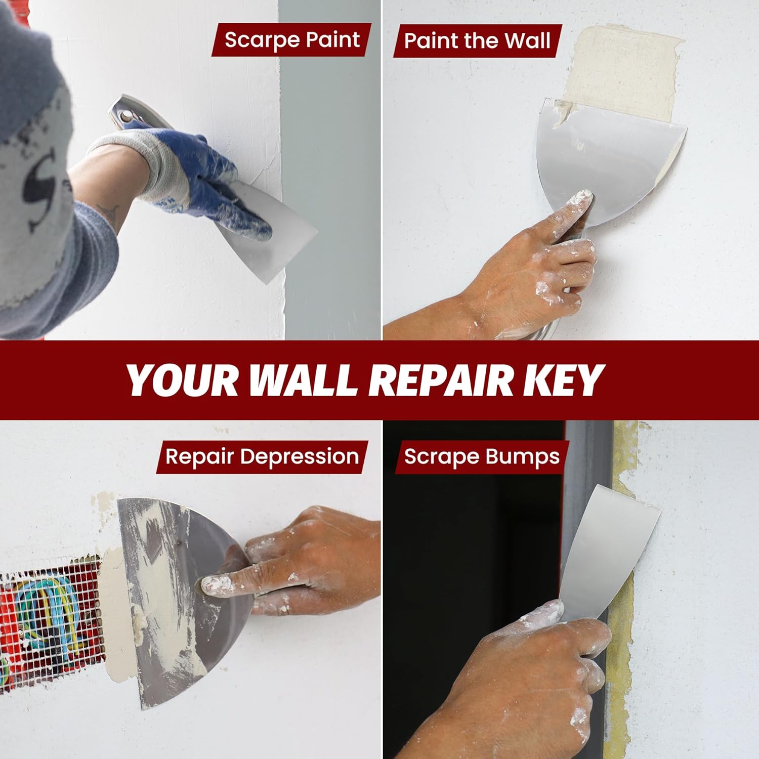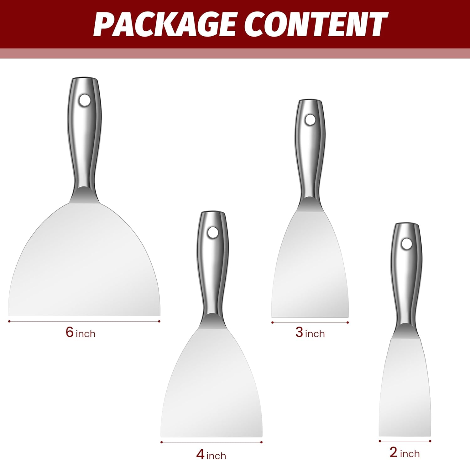 • [ALL STAINLESS STEEL]The putty knives are processed into one piece,that more solid and durable than others.Stainless-steel handle and blade ensure faster application and higher work efficiency