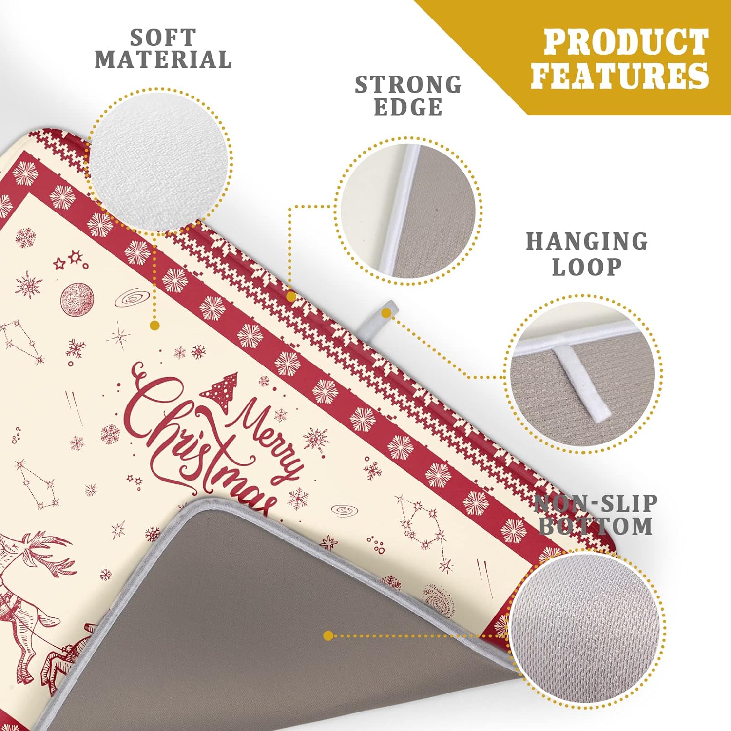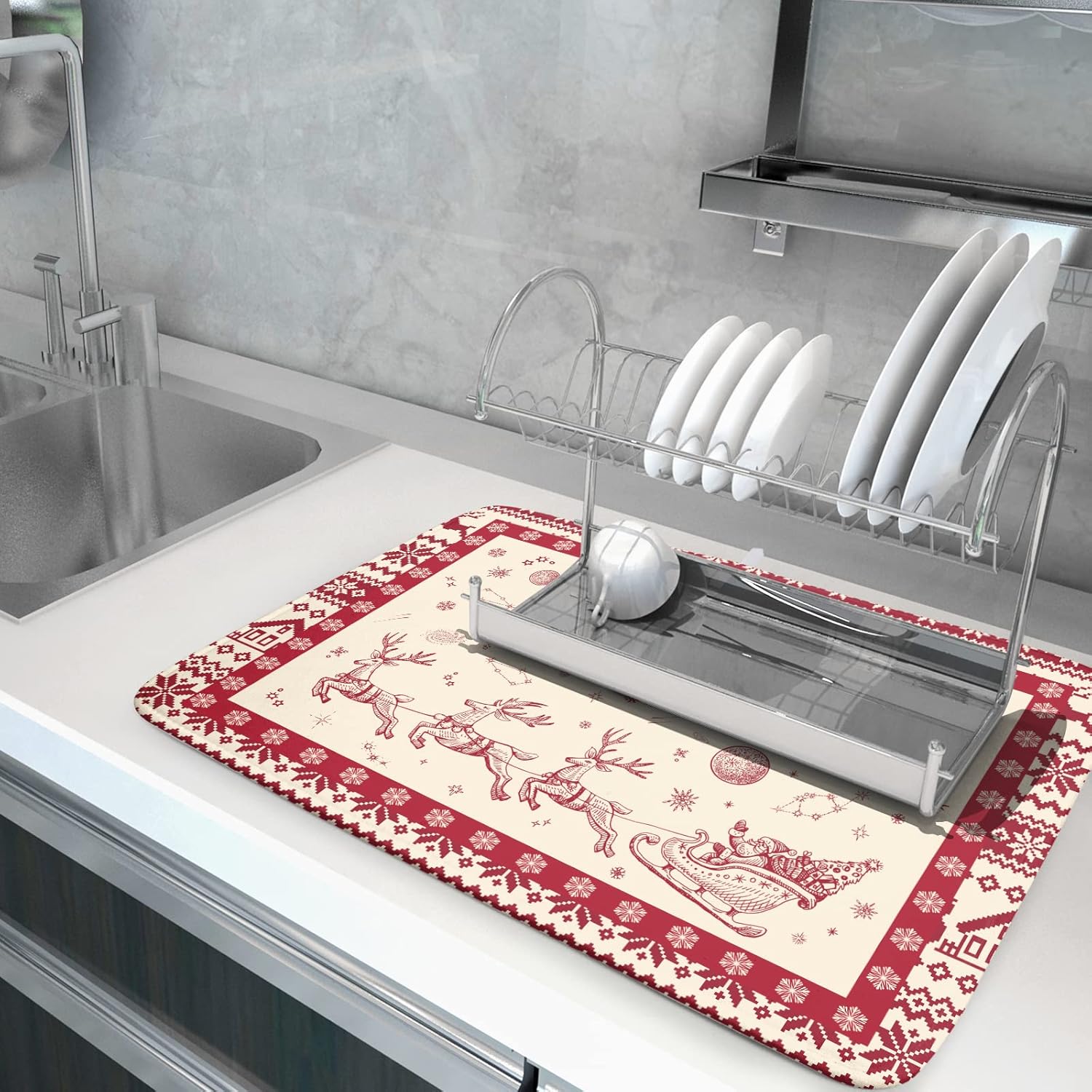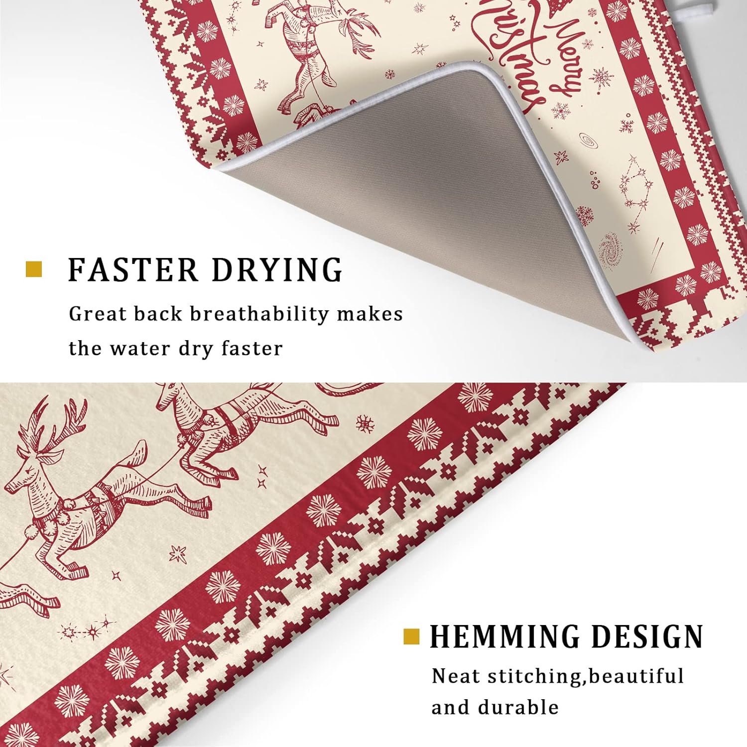 • Easy Storage: The dish drying mat with hanging loop, can be hung on the kitchen wall. This lightweight Christmas Reindeer kitchen dish drying mat, Soft and foldable, Microfiber is naturally, durable, and cleans up easily, and is effortless to clean. frees up space for your kitchen when in use, simply fold up and toss in a drawer or tuck it elsewhere when not in use.