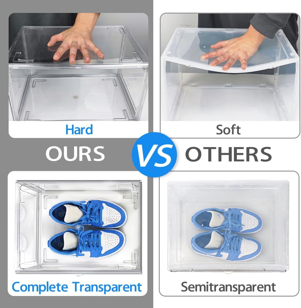 • 【Fit Your High-Tops】: Each shoe crate measures 14.1" L x 10.6" W x 8.9" H, providing ample space for up to size 15 women's shoes or size 14 men's shoes. The sturdy construction, made of thick high-hardness PET acrylic panels, ensures that your high-tops, sneakers, and boots are securely stored.