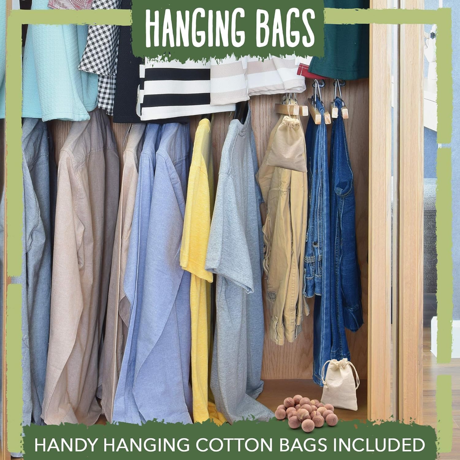 • MULTIPURPOSE & VERSATILE - Our scented cedar balls can be placed in drawers, closets, shelves, bags and more. As our balls are 100% natural, they can touch any fabric directly and won't stain or emit any smell on clothes. Our cedar wood planks for closets also reduce mustiness, absorb excess moisture and keep your wardrobe, as well as your favorite sweater, smelling delectably fresh! Simply put into the cotton bag sachets provided for the best experience.