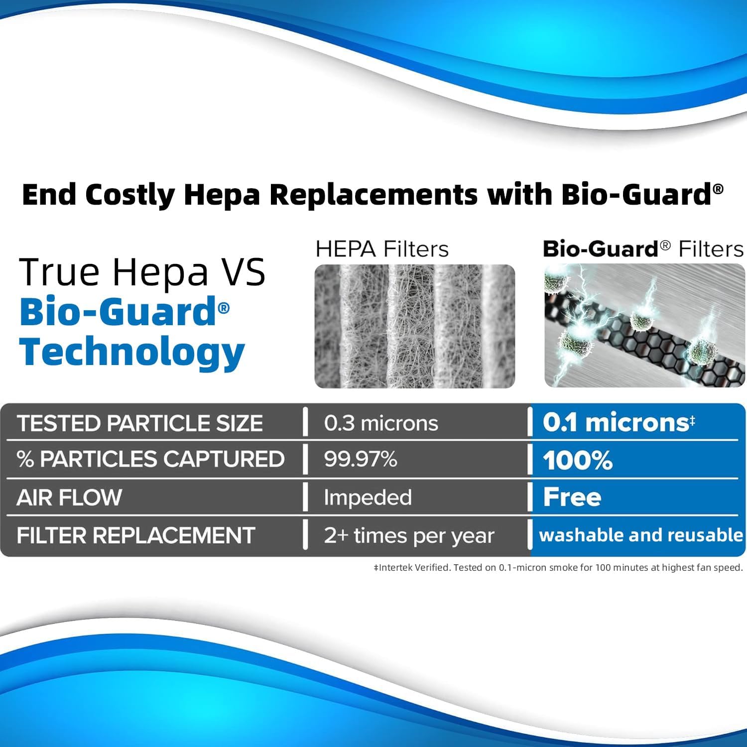 • DUAL 3-STAGE FILTERATION – 2 Stainless-steel prefilter captures large particles. 2 Hi-Tech Bio-Guard Filters & 1 Bio-Guard 360 Filter remove harmful airborne particle pollutants and odors.