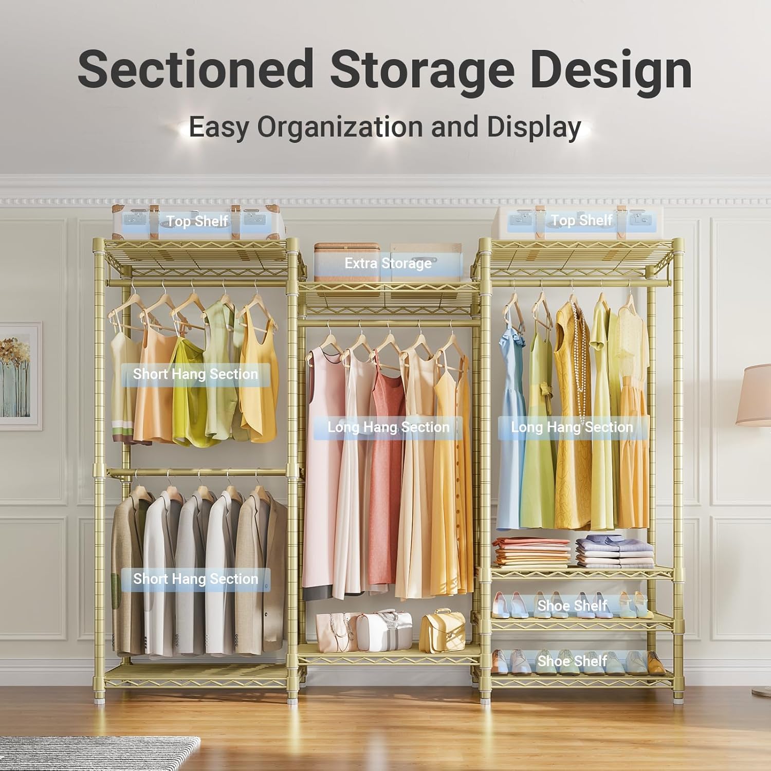 • Multifunction Closet Rack: 6 Tiers Closet Rack maximize the storage area, ensure you enough space to place your clothes, accessories, bedding, lining, shoes, etc. The 4 pcs clothes hanging rods hold up to 60 lbs for each, it is great for hanging suits, coats, long dresses, jackets, pants, shirts or other heavy clothes.