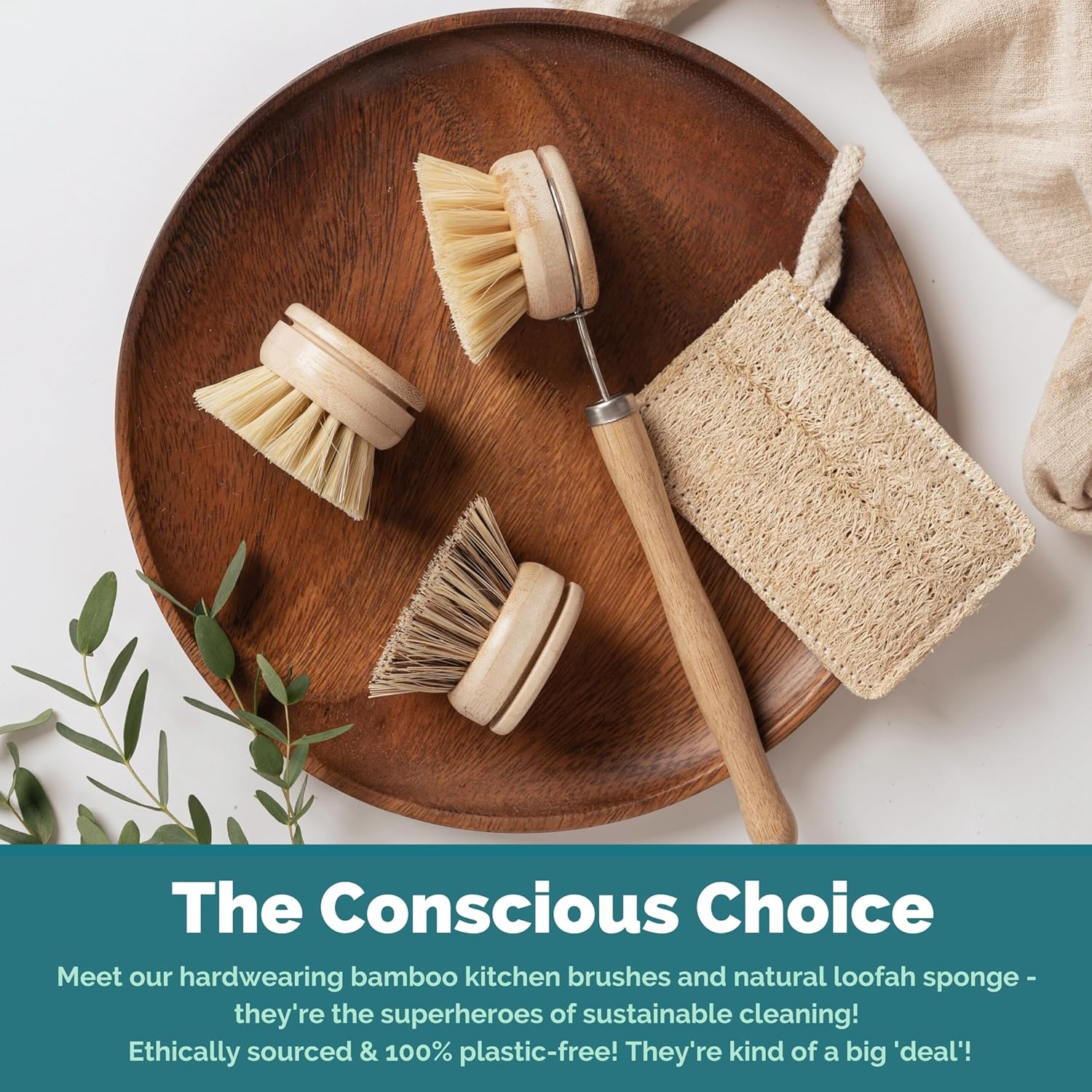 • 🌿 A BETTER WAY TO CLEAN — NATURALLY: Our Bamboo Dish Brush Set includes everything you need to upgrade your cleaning routine. With an ergonomic handle and 3 replacement heads, you can switch between a powerful pot and pan scrubber, a gentle vegetable brush, and a flexible all-round kitchen tool. Complete with a biodegradable loofah sponge, it’s a plastic-free solution that’s as versatile as it is sustainable.