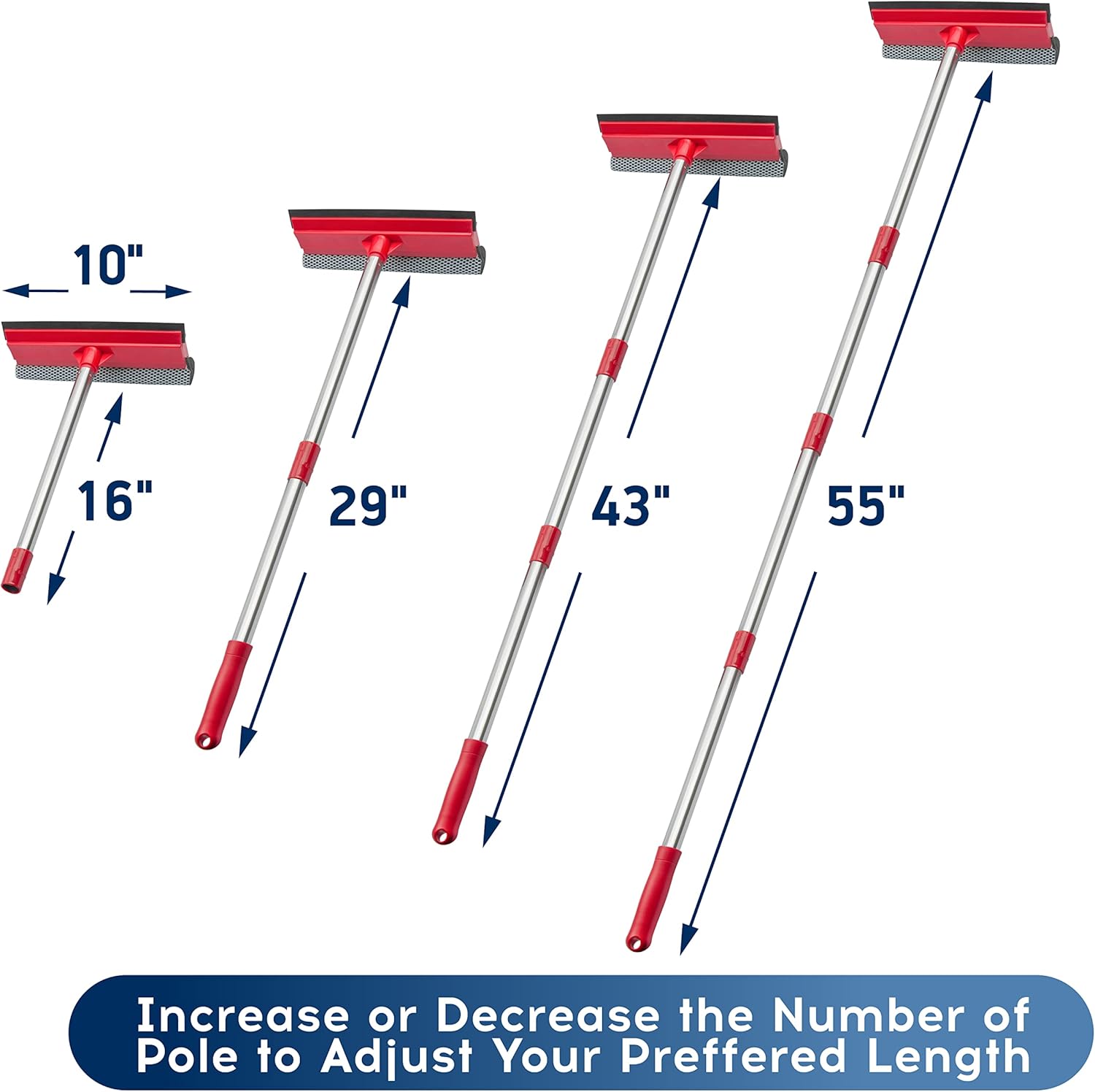• 【EASY TO USE】 2 in 1 Function Window Cleaning Tool With 4 Section Of Extension Poles, You Can Adjust Length According To Your Needs (FROM 16'' TO 55''). Our Telescopic Window Squeegee for Window Cleaning Includes Two Parts: Rubber Strip and High Quality Sponge (10 inches). It is Convenient to Use the Sponge Scrubber to Clean Windows, the Rrubber Squeegee to Wipe Water. This All-in-One Set is All You Ever Need to Quickly and Efficiently Clean Windows, Shower Doors and Any Other Smooth Surface.