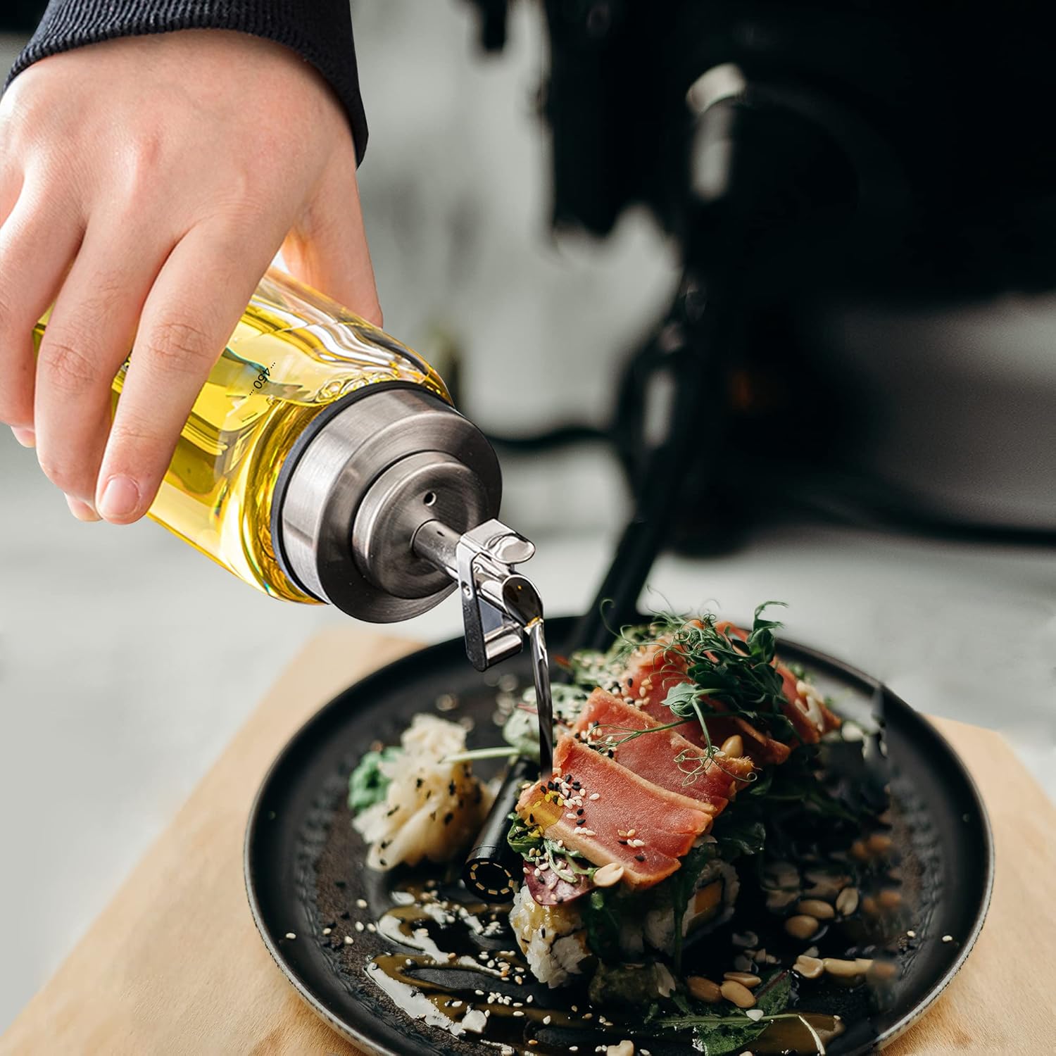 • 【Automatic Stainless Steel Lid】: The heavy metal spout automatically opens and closes with one hand, and the sealed lid keeps dust out. The anti-drip spout with clear ML scale makes pouring oil or vinegar easy and precise.