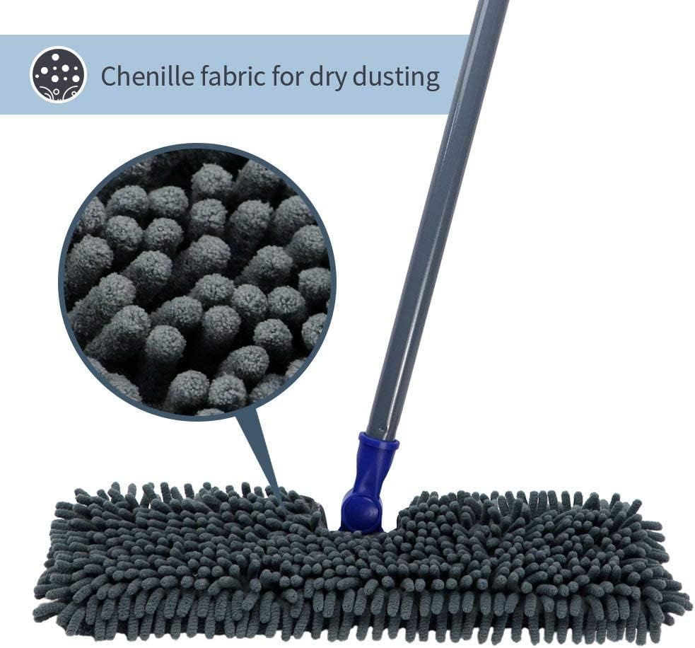 • Effective Cleaning:The microfiber mop head is good at absobing water and grabbing small pieces of dust, dirt, pet fur, hair and other waste during cleaning. Also, the chenille fabric is soft enough not to leave scratches.