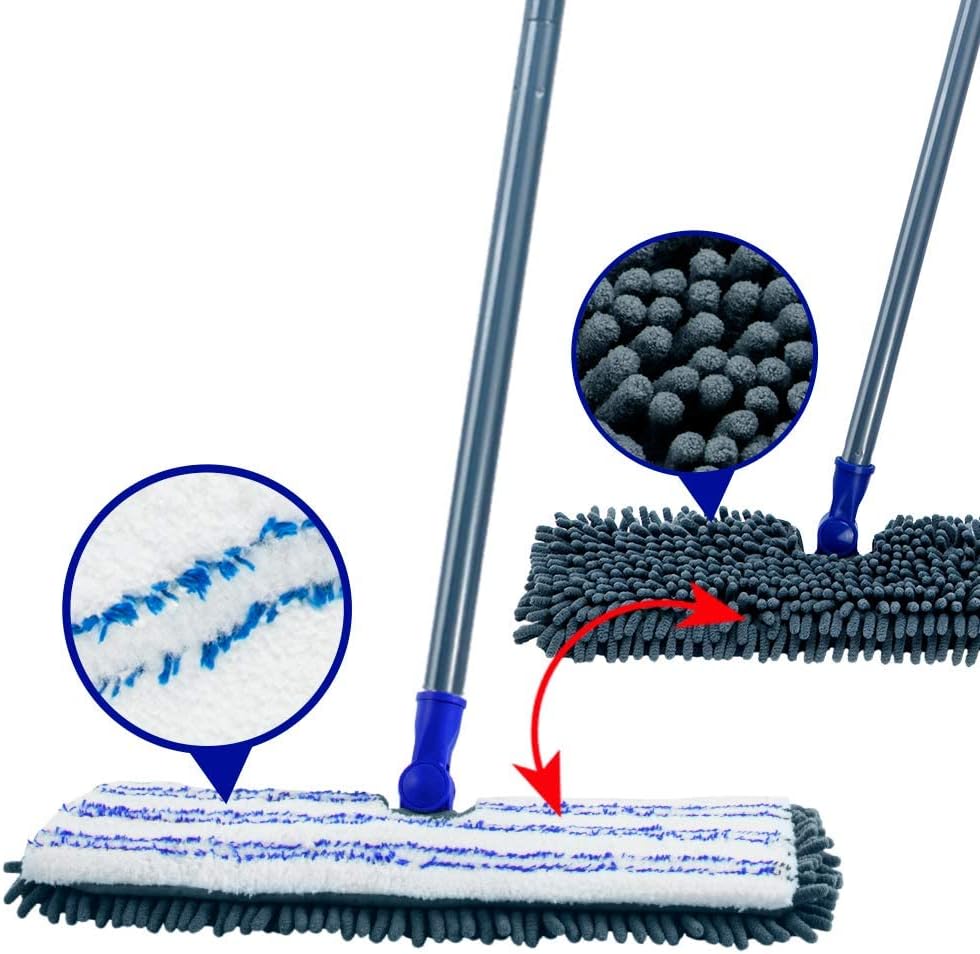 • Double-Sided Mop Pad:These flip mop pads can be used both wet and dry.One side features chenille fabric for dry dusting from floors,ceilings,and other surfaces. Alternatively, you can moisten the microfiber side with water for deep cleaning.