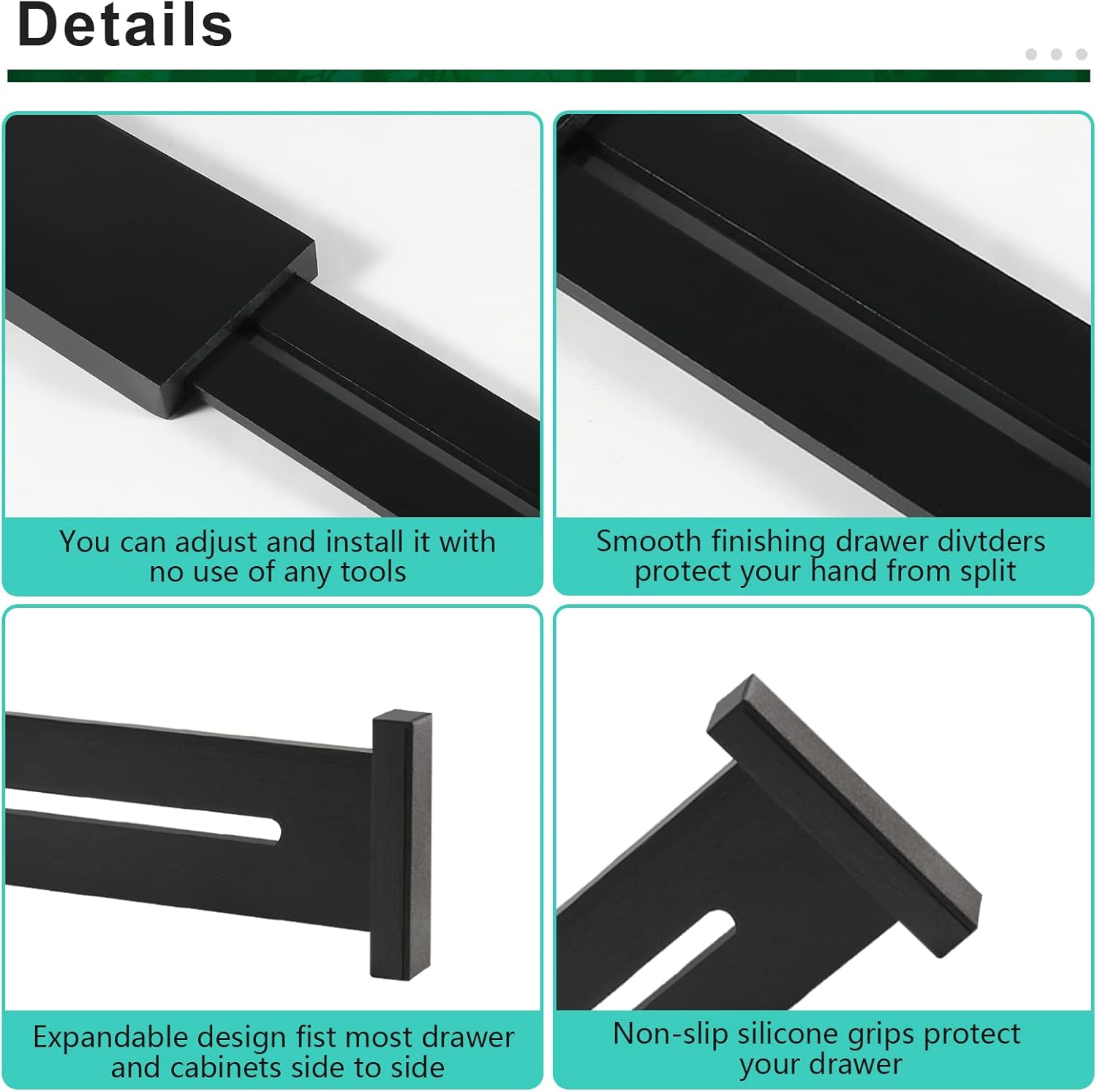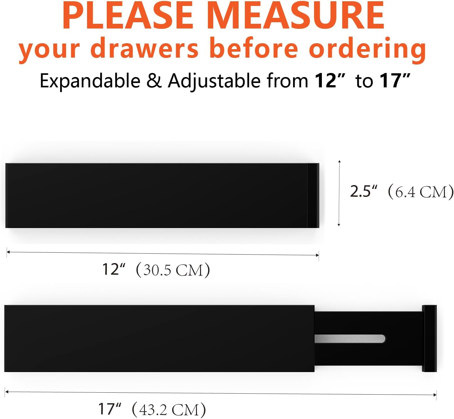 • EXPANDABLE AND ADJUSTABLE DESIGN: The drawer organizer set comes with four expandable drawer divider pieces, and each drawer divider is 2.5" tall, 0.6" thick and expandable from 12" to 17" in full length; so that you can rearrange to your desired structure, our drawer separators are adjustable to fit large spacious kitchen drawers and even your shortest and most narrow office drawers. So you can take full advantage, be sure to measure your drawers prior to purchase as our expandable drawer organizer set