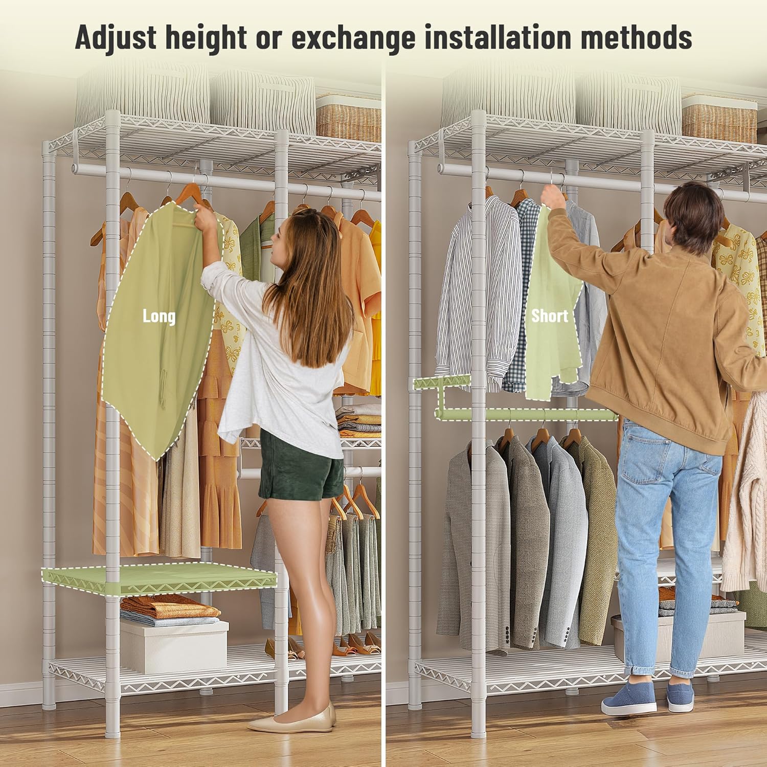• 【Sturdy Clothing Rack】The heavy duty clothing rack is solid and extremely sturdy, it features stable. Which has managed to organize all your clothing, giving you extra space for additional clothing. Easy access in bedroom, cloakroom, clothing store, laundry room and more.