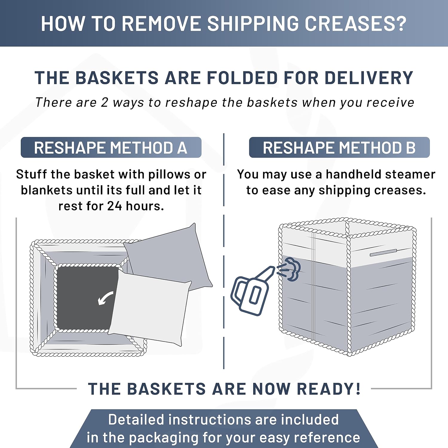 • No More Wrinkly Floppy Woven Baskets: Prepare to have your socks knocked off (and then neatly organized), when you take a peek at our woven rope basket set. No more ‘permanently’ creased up, floppy storage basket here. Thanks to our unique folding method and quality rope, shaping is easy with the instructions provided!