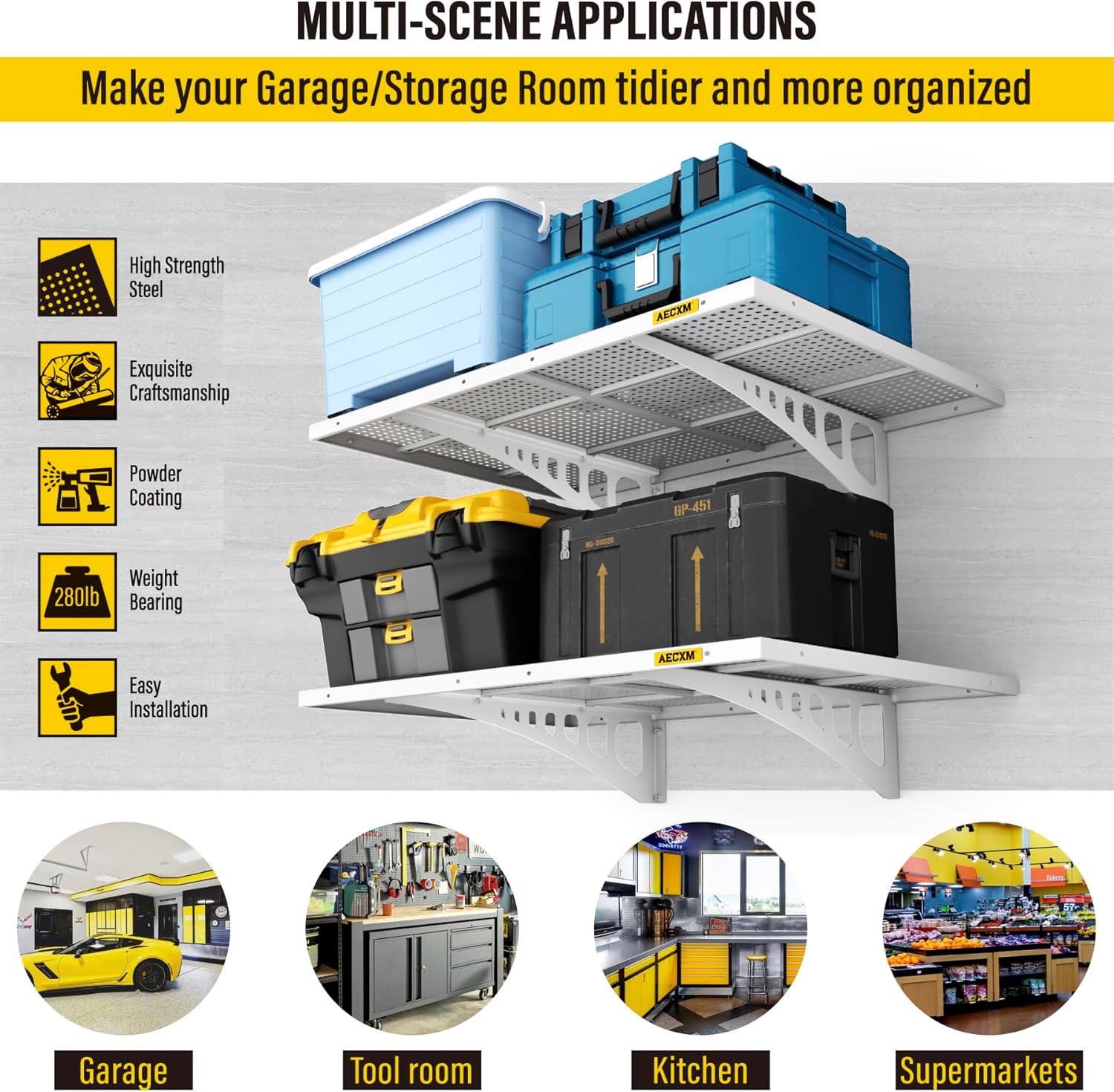 • Rigorous Load Testing: When properly installed on wood studs, the garage wall shelf total weight capacity reaches at least 560 lbs, with each individual panel supporting to 280lbs with no bending or warping