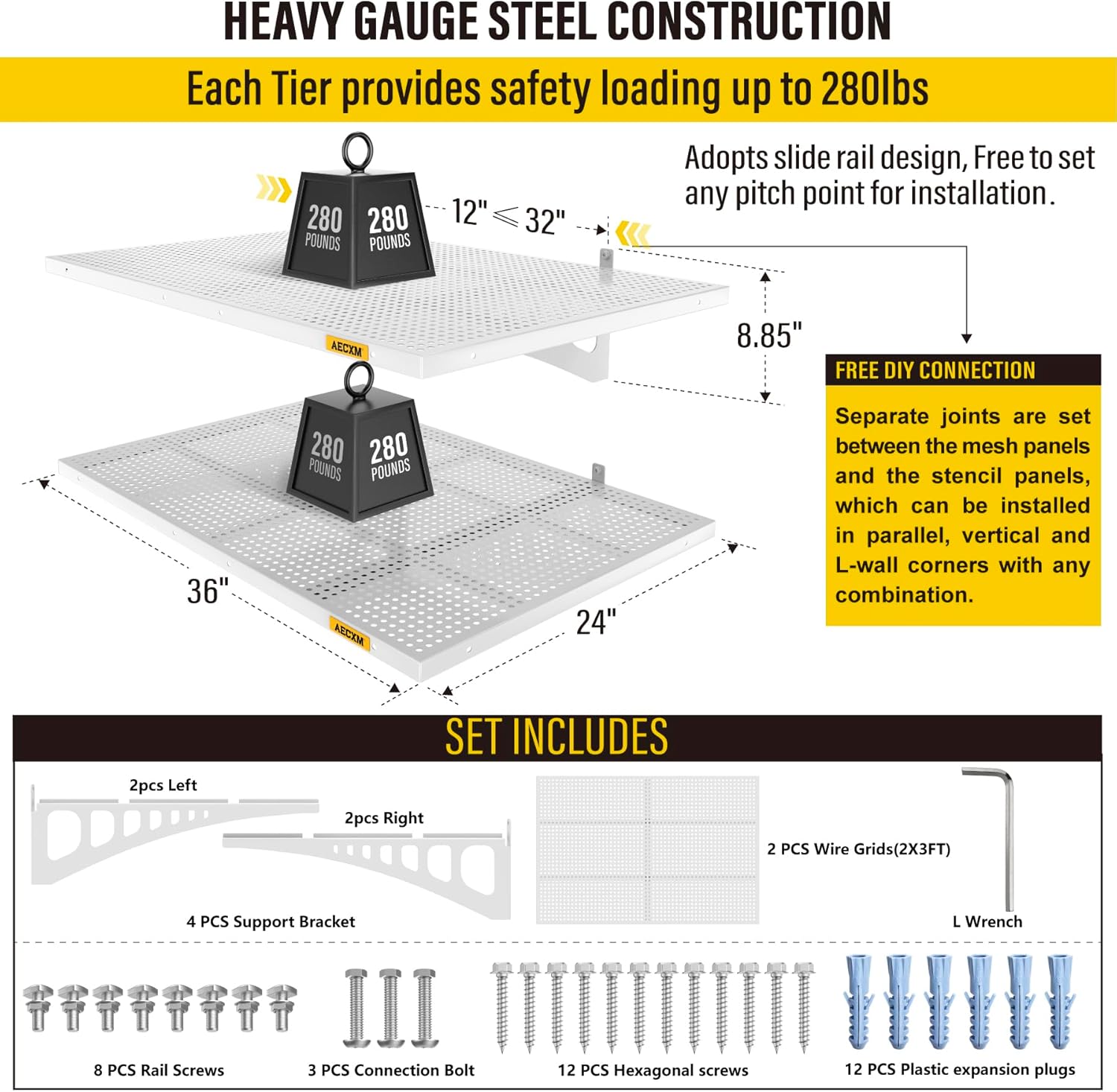 • Innovative Design: Unlike fixed wood stud spacing systems, Aecxm garage wall shelving feature an exclusive sliding rail screw design, allowing flexible installation on any wood stud spacing within the panel's length. Adjust freely and hassle-free