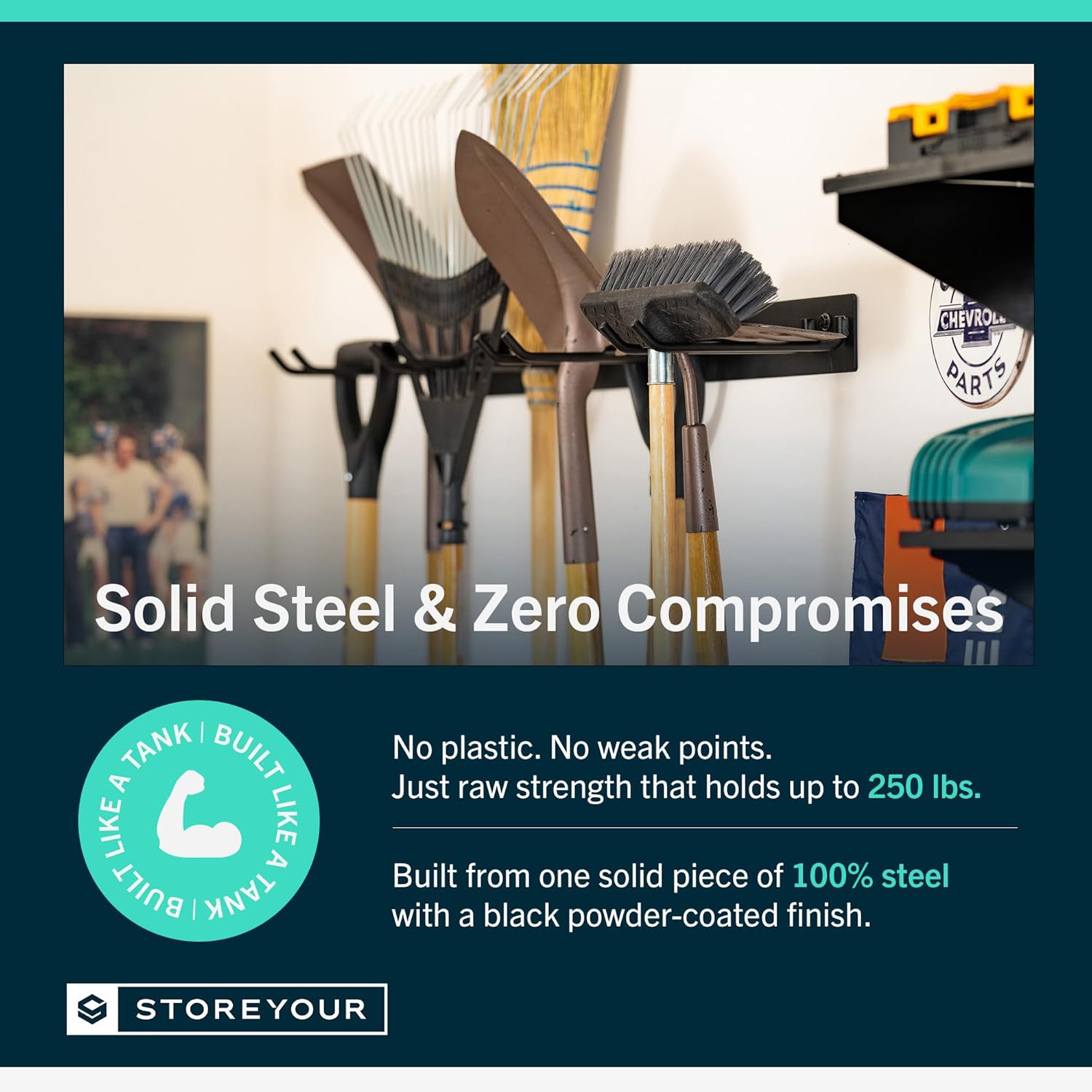 • ULTRA-STRONG & BUILT TO LAST – Made from 100% solid steel with no plastic parts or assembly required, this tool rack is crafted to withstand heavy-duty use. Each wall-mounted storage rack arrives fully welded and powder-coated to resist rust and corrosion. Perfect for organizing tools, outdoor storage gear, or even a fishing pole rack for the garage.