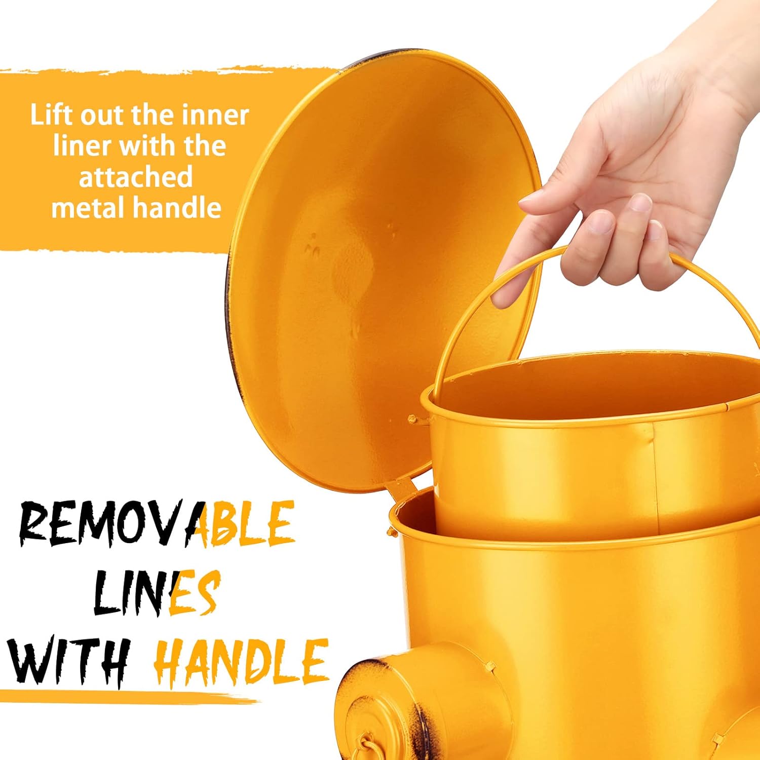 • Removable Inner Bucket: the retro metal trash can includes a removable inner bucket with handle for easy removal and emptying of trash for easy portability