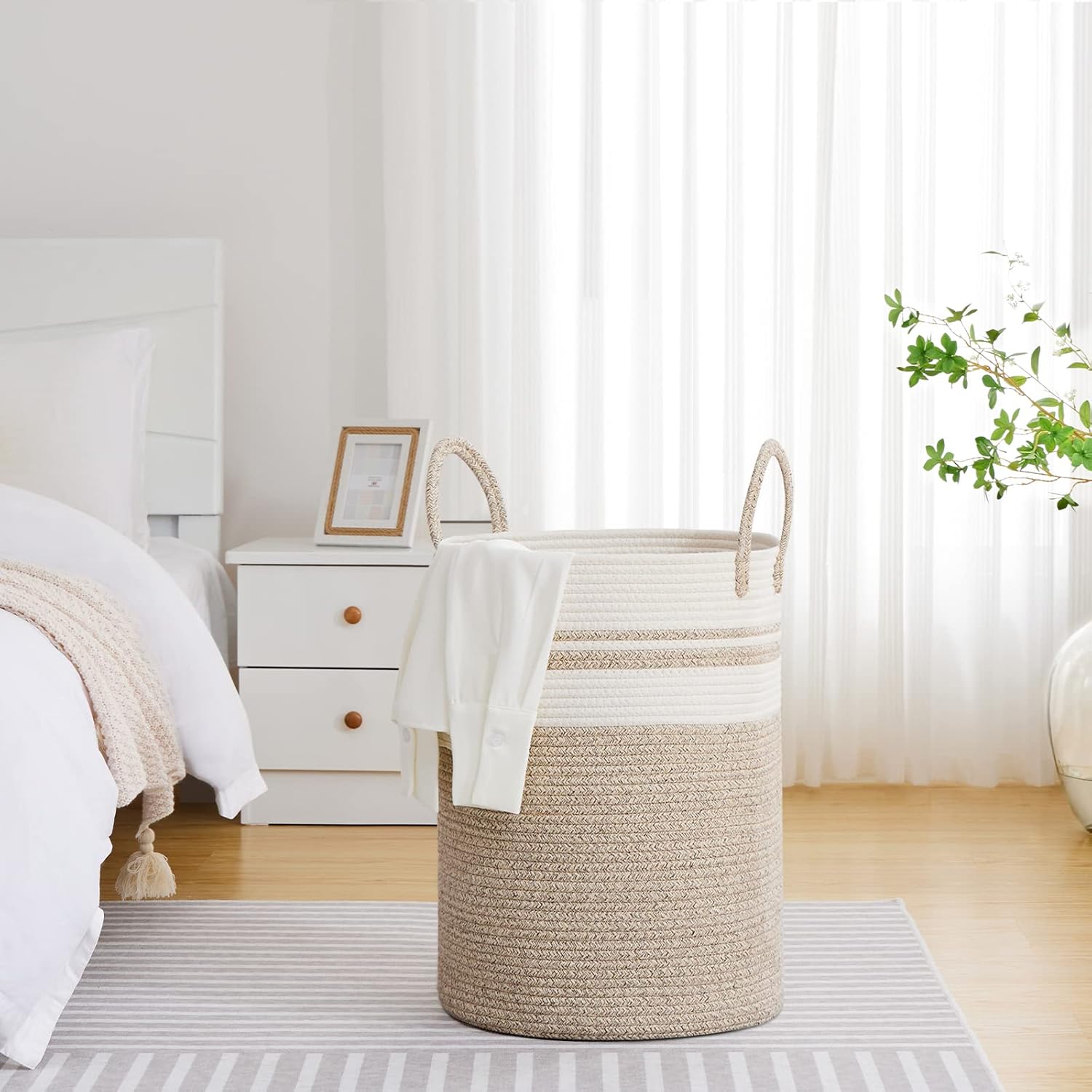 VIPOSCO Large Laundry Hamper, Tall Woven Rope Storage Basket for Blanket, Toys, Dirty Clothes in Living Room, Bathroom, Bedroom - 100L Brown & White