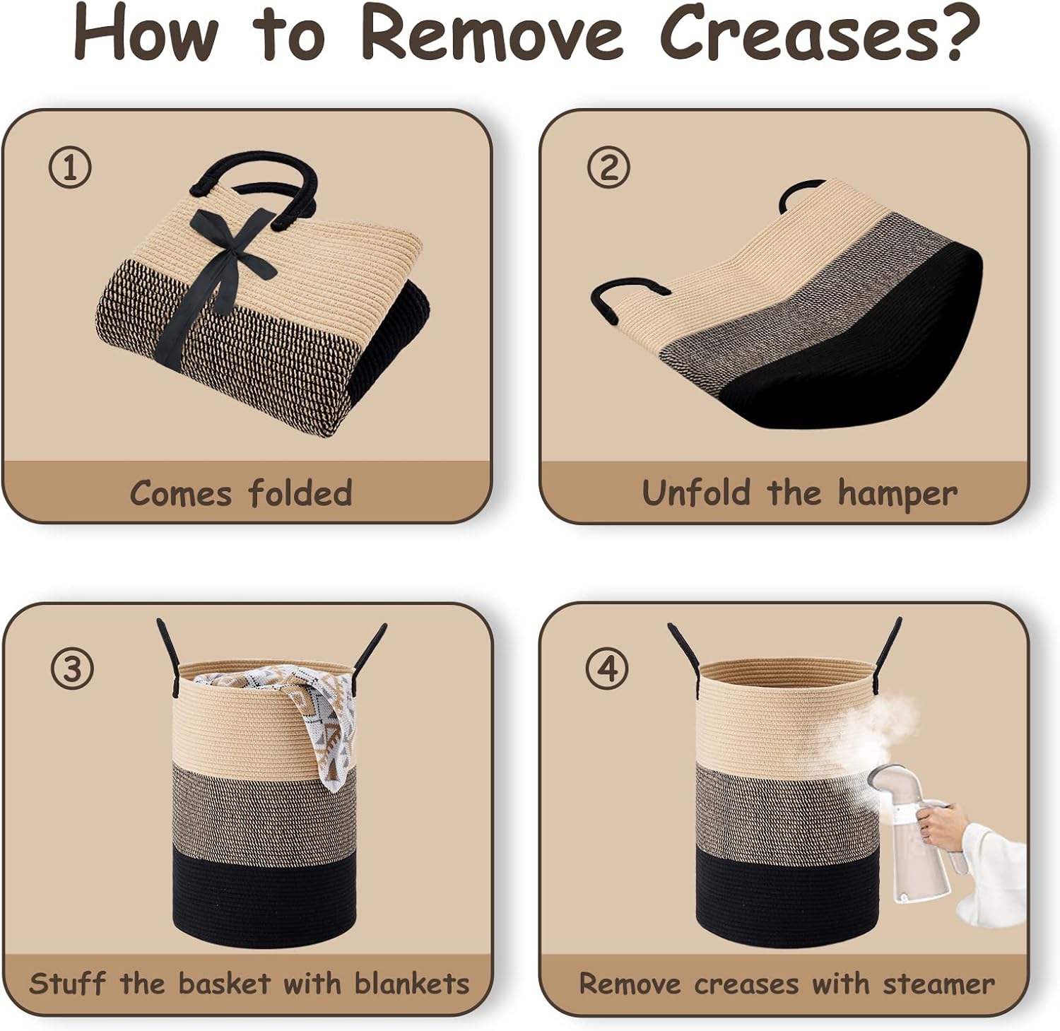 • ❤【Restore Elegant Shape】 To improve shipping efficiency, foldable woven rope hampers are packed compactly. You can put some blankets or small quilts in it and give it some time to regain its shape. Iron is a great idea to remove the creases.