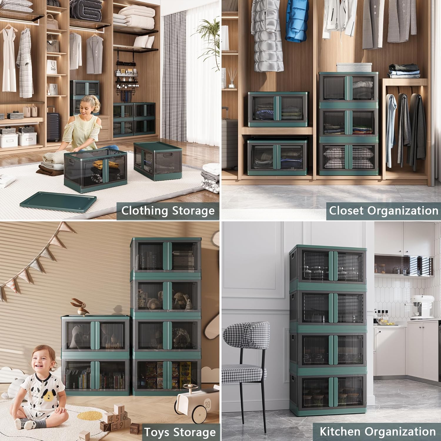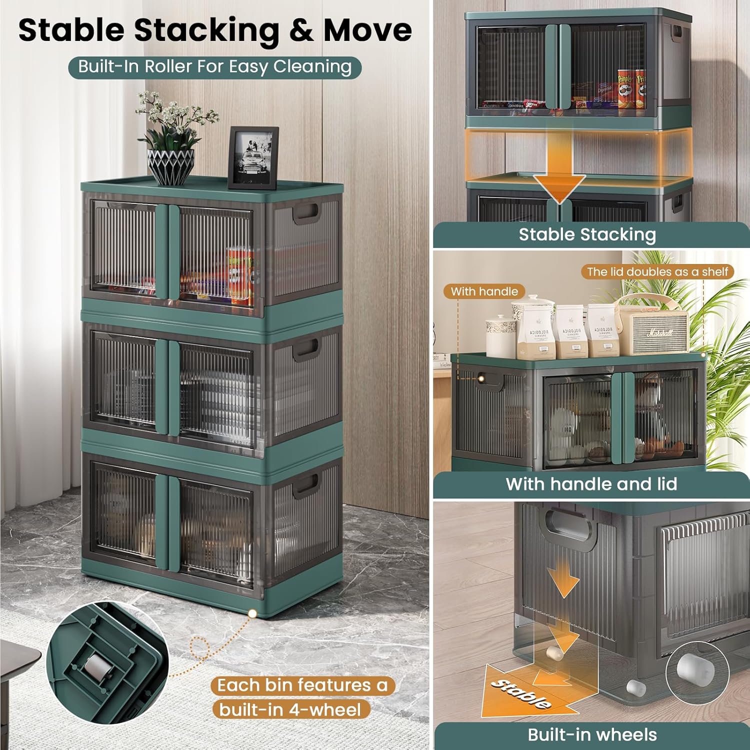 19Gal Collapsible Storage Bins with Lids & Wheels - 4 Pack Stackable with Doors, Heavy-Duty Plastic Containers for Home/Office, Green