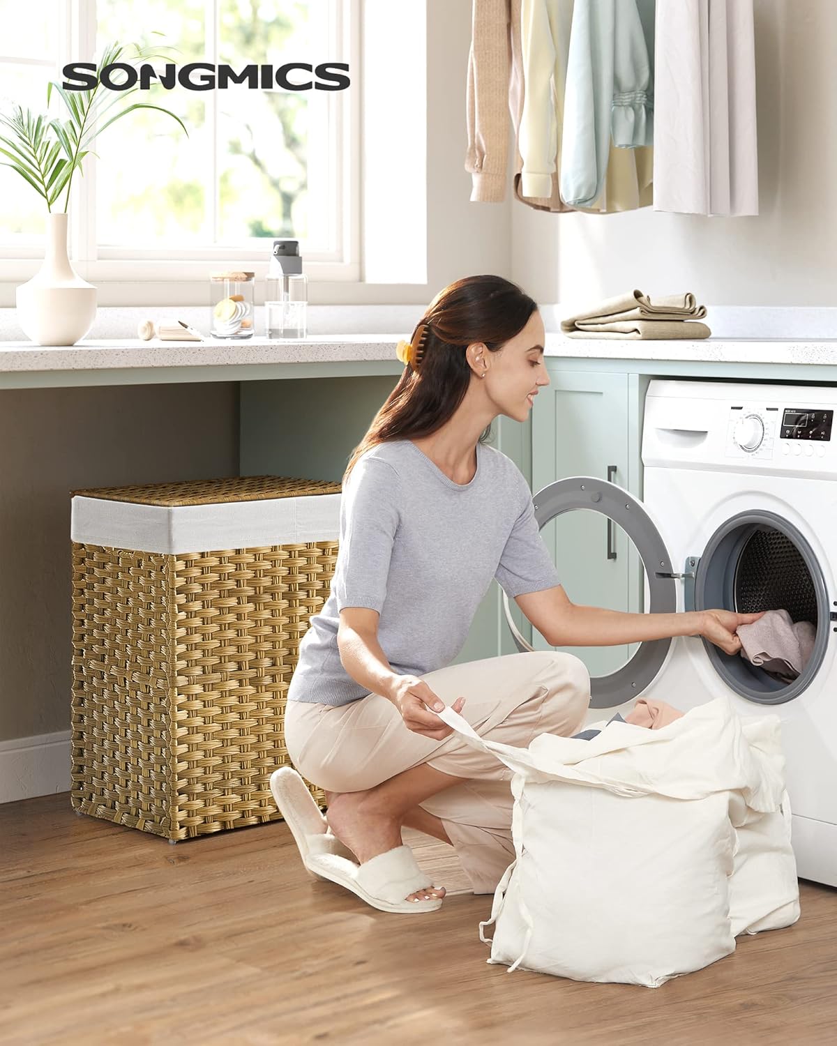 SONGMICS Laundry Hamper with Lid, 90L Clothes Hamper with 2 Removable Liner Bags, 6 Mesh Bags, Wicker Laundry Basket, Double Laundry Hamper for Bathroom, 13 x 18.1 x 23.6 Inches, Natural ULCB251N01V1