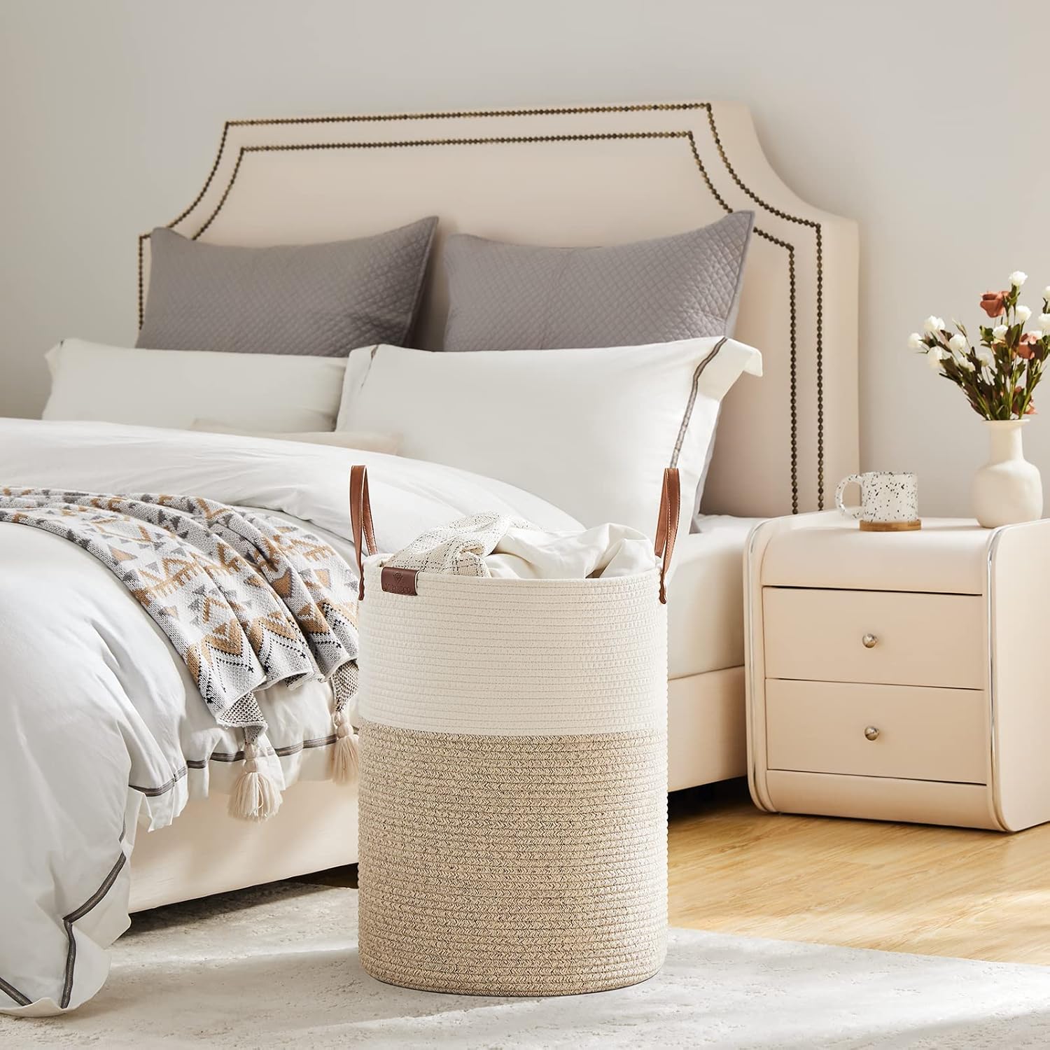 VIPOSCO Tall Laundry Basket, Large Dirty Clothes Hamper with Leather Handle, Woven Rope Storage Basket for Blanket, Toy In Living Room, Bathroom, Bedroom - 58L White & Brown