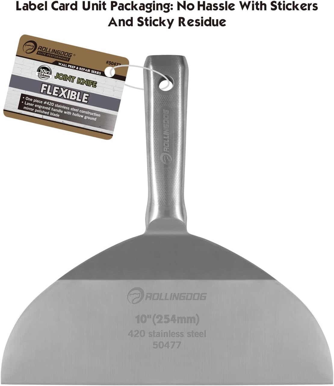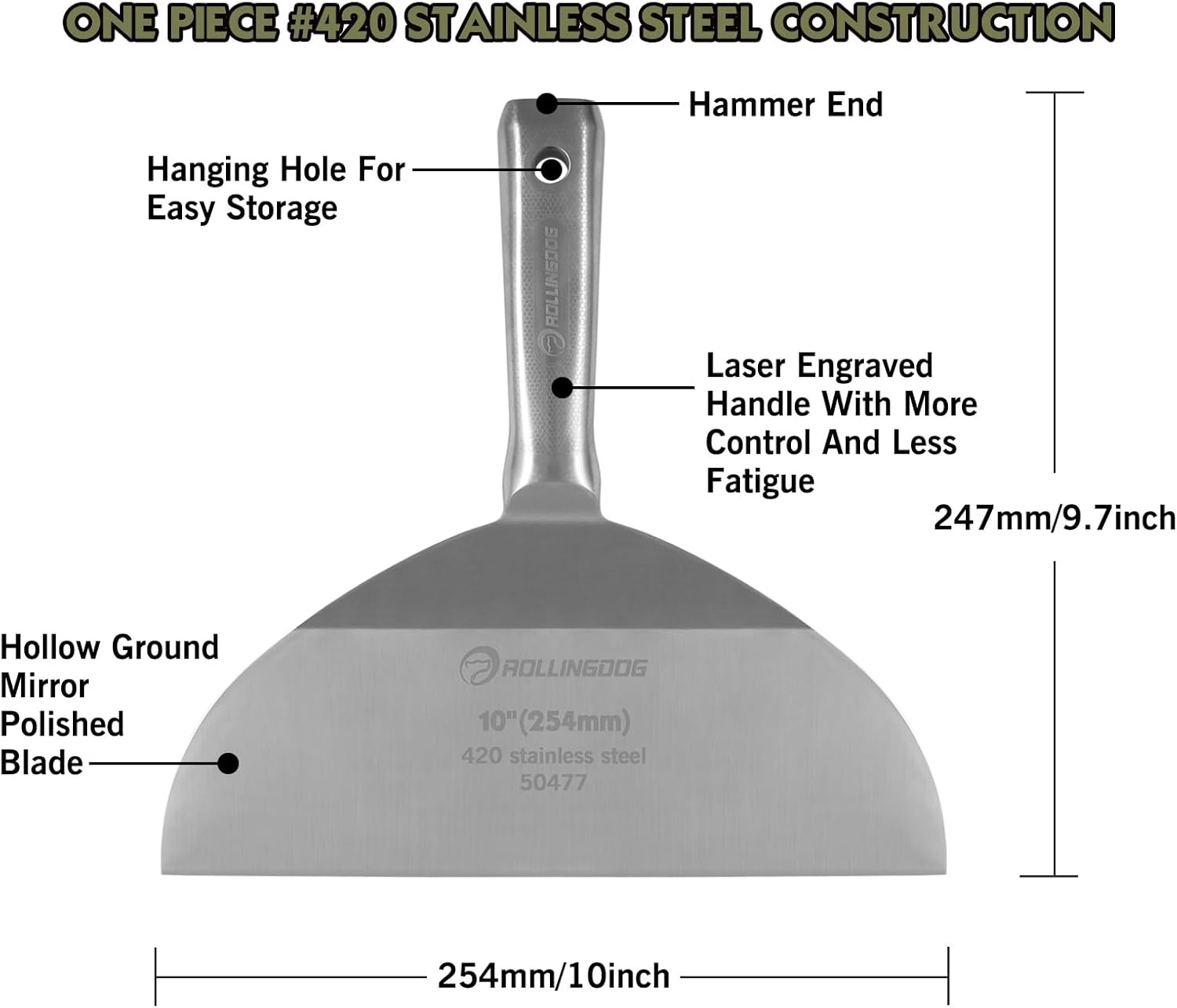 ROLLINGDOG 10 inch Putty Knife - 420 Stainless Steel One Piece Drywall Joint Knife Mirror Polished Blade for Drywall, Painting