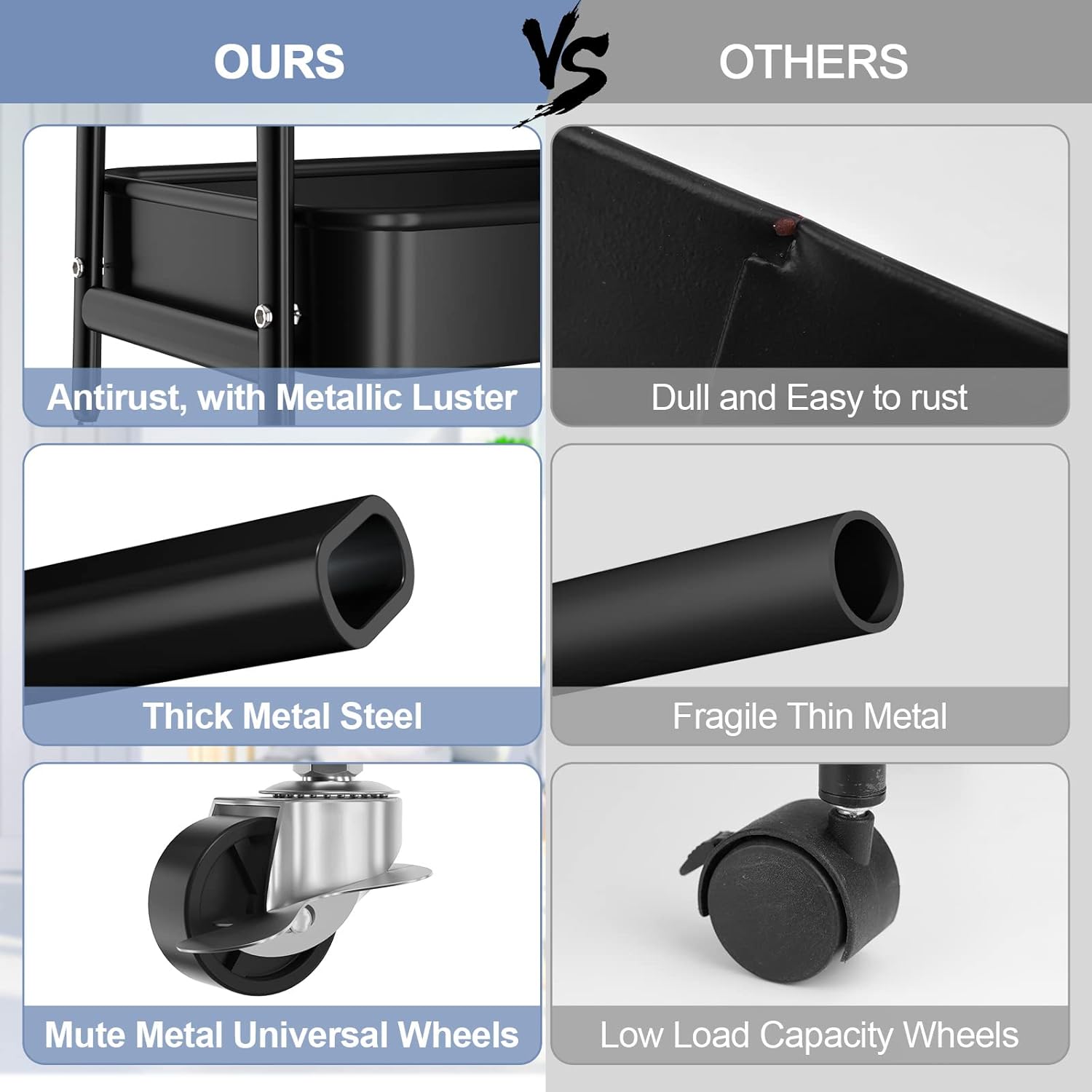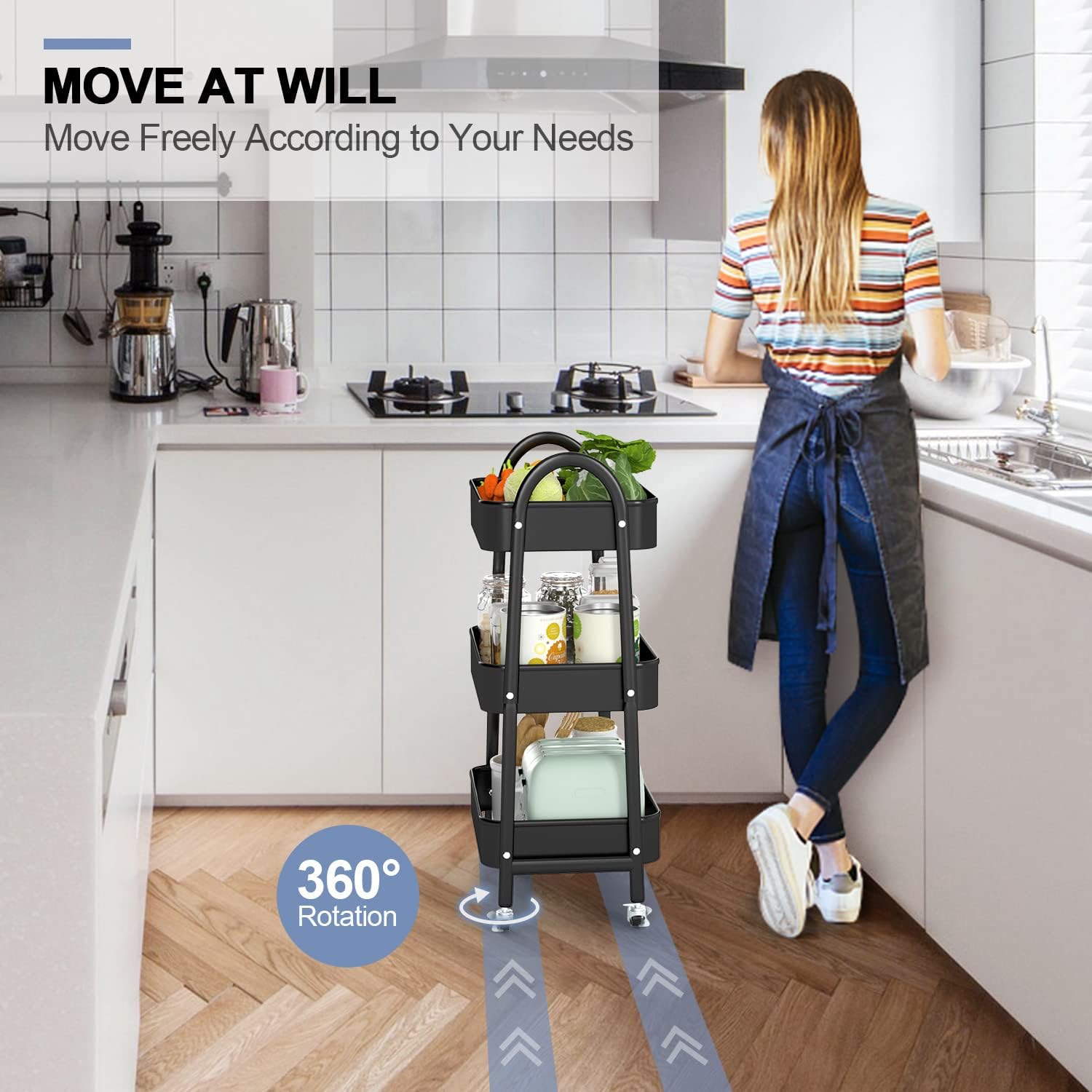 • Multifunctional Rolling Cart: Our utility cart serves multi purposes, suitable for virtually any application and any room. It can be snack cart, tool cart, service cart, book cart, or organization rack in your kitchen, bedroom, laundry room, bathroom, living room, office, garage, and workshop, etc.