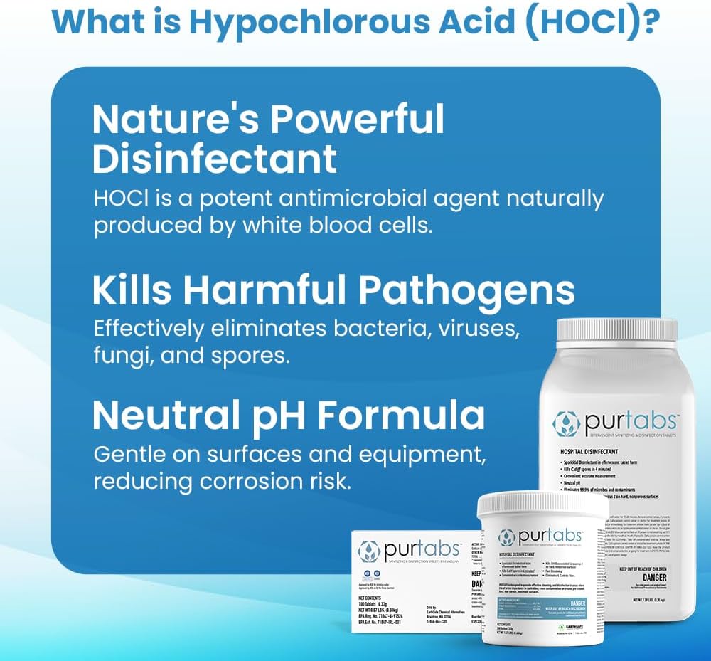 • EPA Registered Disinfectant & Sanitizer: PurTabs destroy 99.9% of viruses and bacteria, including tough pathogens, providing powerful sanitation for food service, healthcare, and home environments