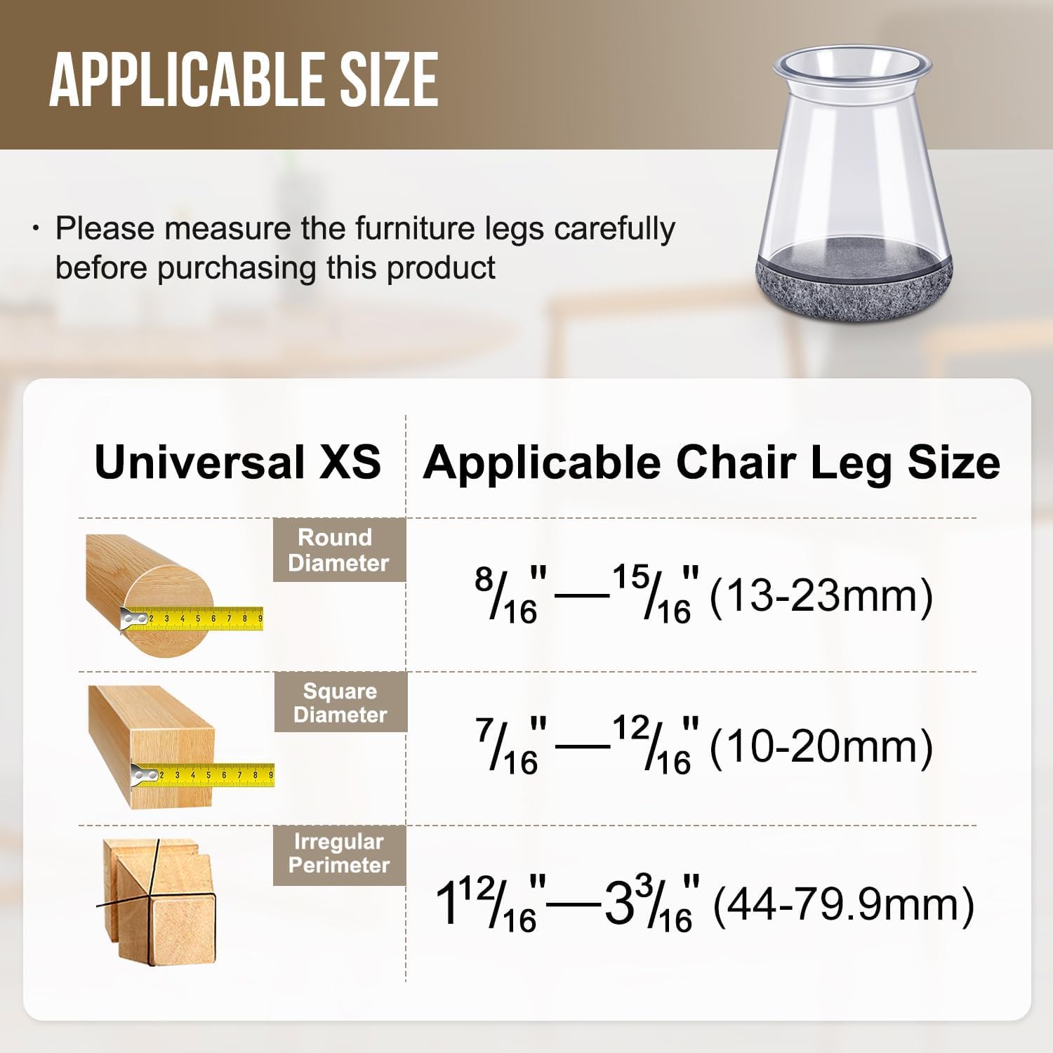 • Applicable size:Suitable for chair foot with perimeter of 4 9/16" to 6 4/16" (116-160mm). Round diameter 1 5/16" to 2" (33-50mm). Square side length 1 3/16”to 1 9/16" (29-40mm)