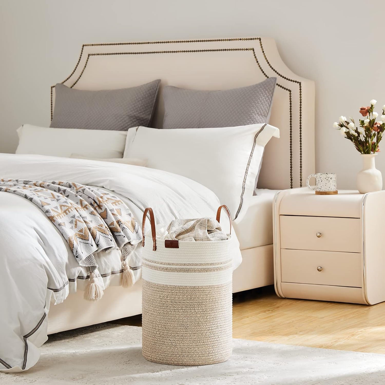 • ❤【MINIMALIST DECORATIVE BASKET】 This cotton rope woven basket with simple color splicing, leather handles and label can match different kinds of rooms, like living room, bathroom, bedroom, dorm, laundry room and nursery room. The round basket is also a fantastic gift idea for housewarming, baby showers, Valentine's Day and any other occasions.