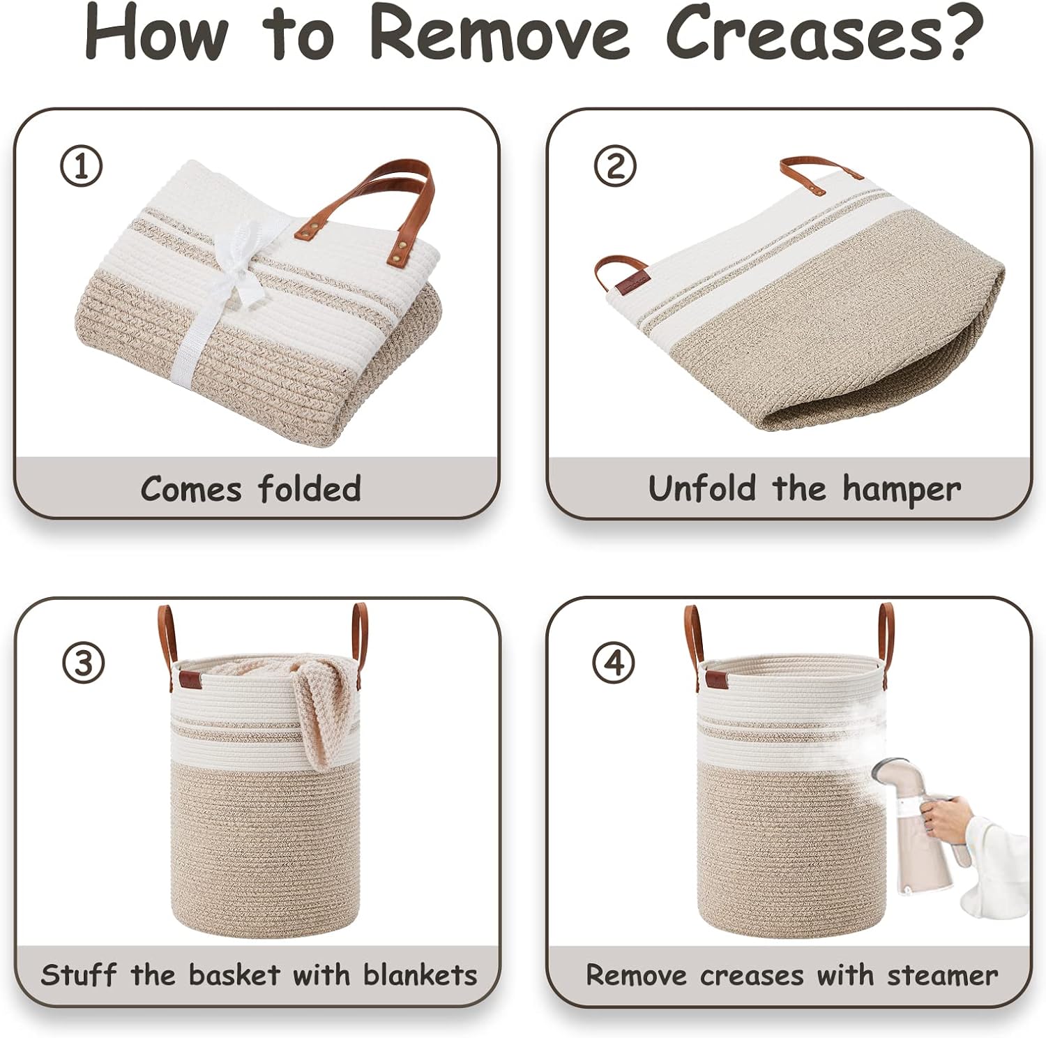 • ❤【WAY TO RESTORE ELEGANT SHAPE】 Our collapsible baskets are folded during shipping. Please fill the hamper with clothes or blankets for a period of time. If you want to remove creases from the surface of the tall basket, you can use a steamer.