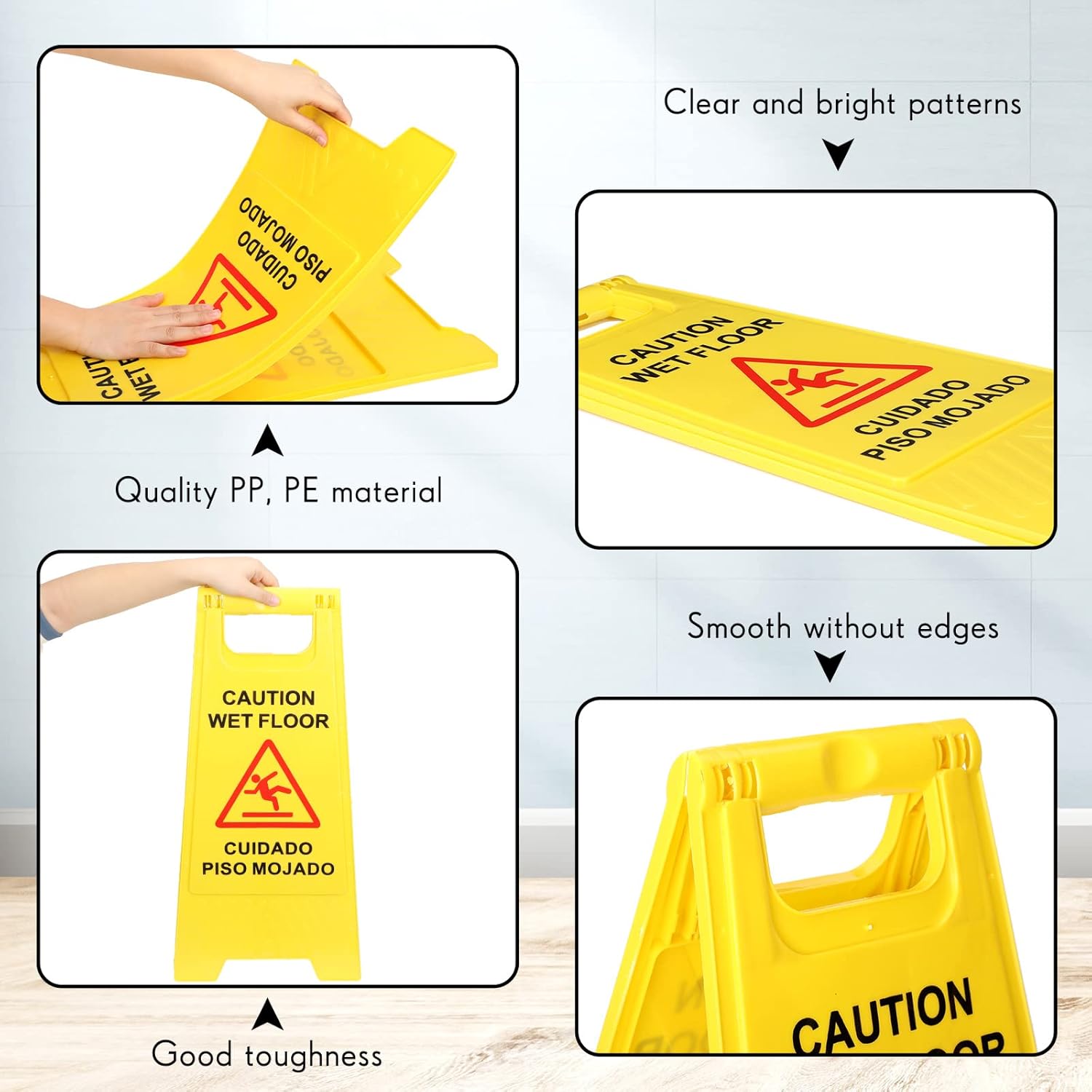 • Bilingual Signs: cuidado piso mojado foldable bilingual alert sign adopts a combination of English and Spanish, which can simultaneously remind people of different language backgrounds to pay attention to the slippery ground, greatly reducing the accident of falling due to slippery ground