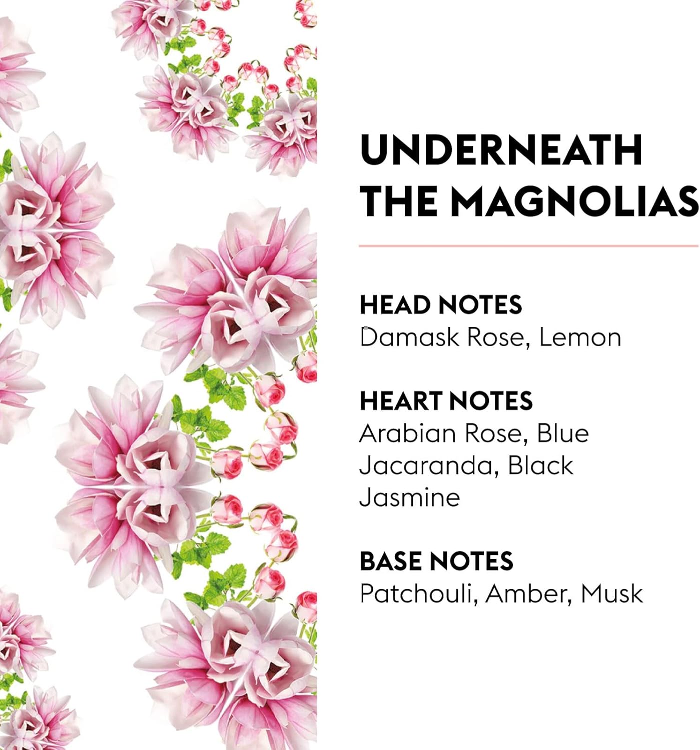 • UNDERNEATH THE MAGNOLIAS: THE HEART OF BOTANICAL ELEGANCE Imagine the first bloom of damask rose at dawn, the zest of fresh lemon leaves, the intoxicating whisper of Arabian rose at twilight - this fragrance weaves these moments into a singular olfactory experience. Top notes of sparkling lemon and damask rose give way to heart notes of blue jacaranda and black jasmine, resting on a foundation of earthy patchouli, warm amber, and sensual musk. Each element harmonizes to create a scent that is both romantically floral and profoundly sophisticated.