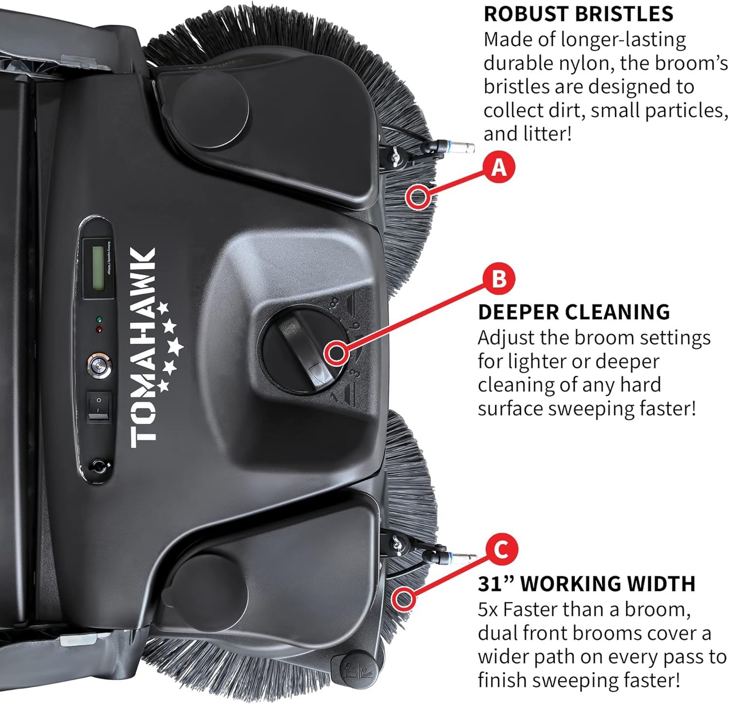 • Sweep up to 5 hours on a single charge Cover 38,000 ft²/hr indoors and outdoors and on dry or wet surfaces Sweeper has a working width of 31 in. covering a wider path Air filter prevents dust kick-up while sweeping for cleaner results Has a 1-gallon dust suppression tank with a pump power of 30W Powered triple brush sweeper system With a lightweight and compact design capable of fitting through doorways and easily stored as the handles can fold fully for storage