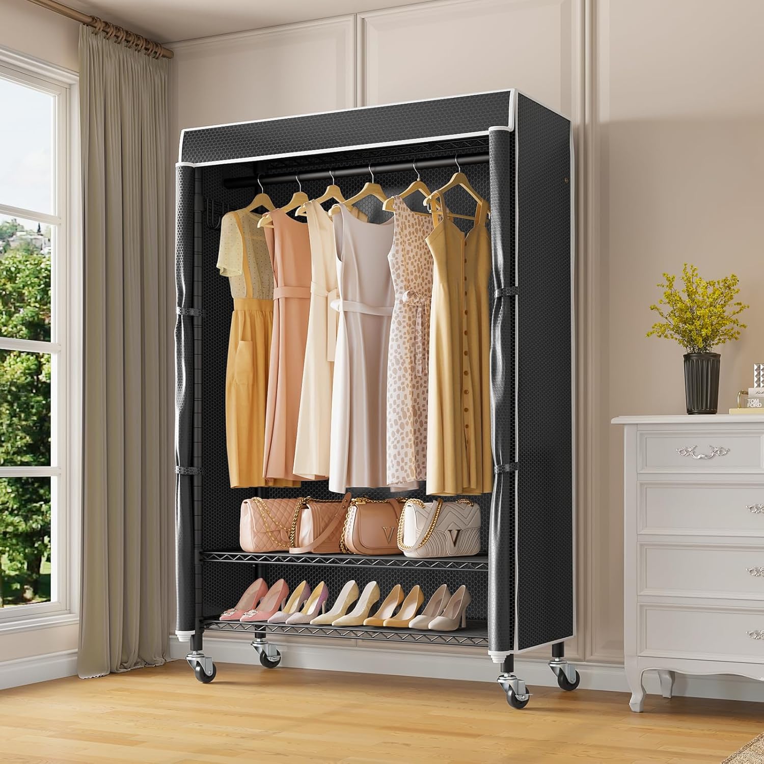 VIPEK R3C Rolling Clothes Rack with Cover Portable Closet for Hanging Clothes, Heavy Duty Garment Rack Freestanding Racks with Wheels&Side Hooks, Black Rack with Black Upgraded Polyester Cover