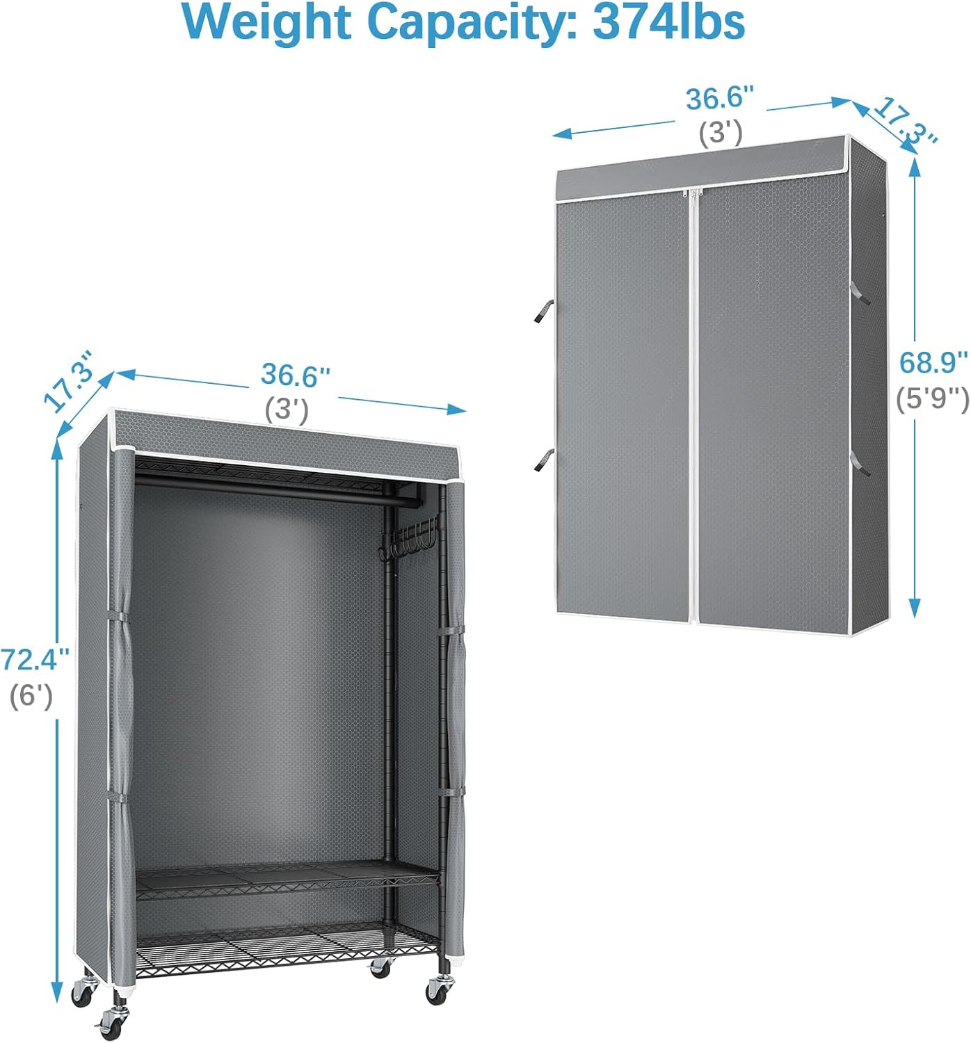VIPEK R3C Rolling Clothes Rack with Cover Portable Closet for Hanging Clothes, Heavy Duty Garment Rack Clothing Racks with Wheels& Hanging Rod, Black Racks with Grey Upgraded Polyester Cover