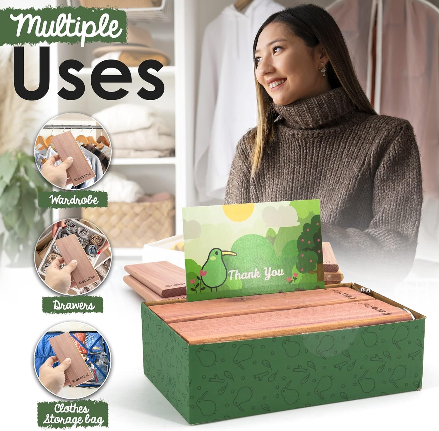 • PROTECT OUR PRECIOUS PLANET - At ecoKiwi, we were tired of seeing excess waste and unsustainable products, so we created our cedar planks for closets to be long-lasting and sustainably sourced. Our cedar closet hangers eliminate the need for any chemicals or plastics to be used. Just pure, sustainable and effective eastern red cedar chips for storage. Join the eco friendly revolution with our cedar blocks for closet products.