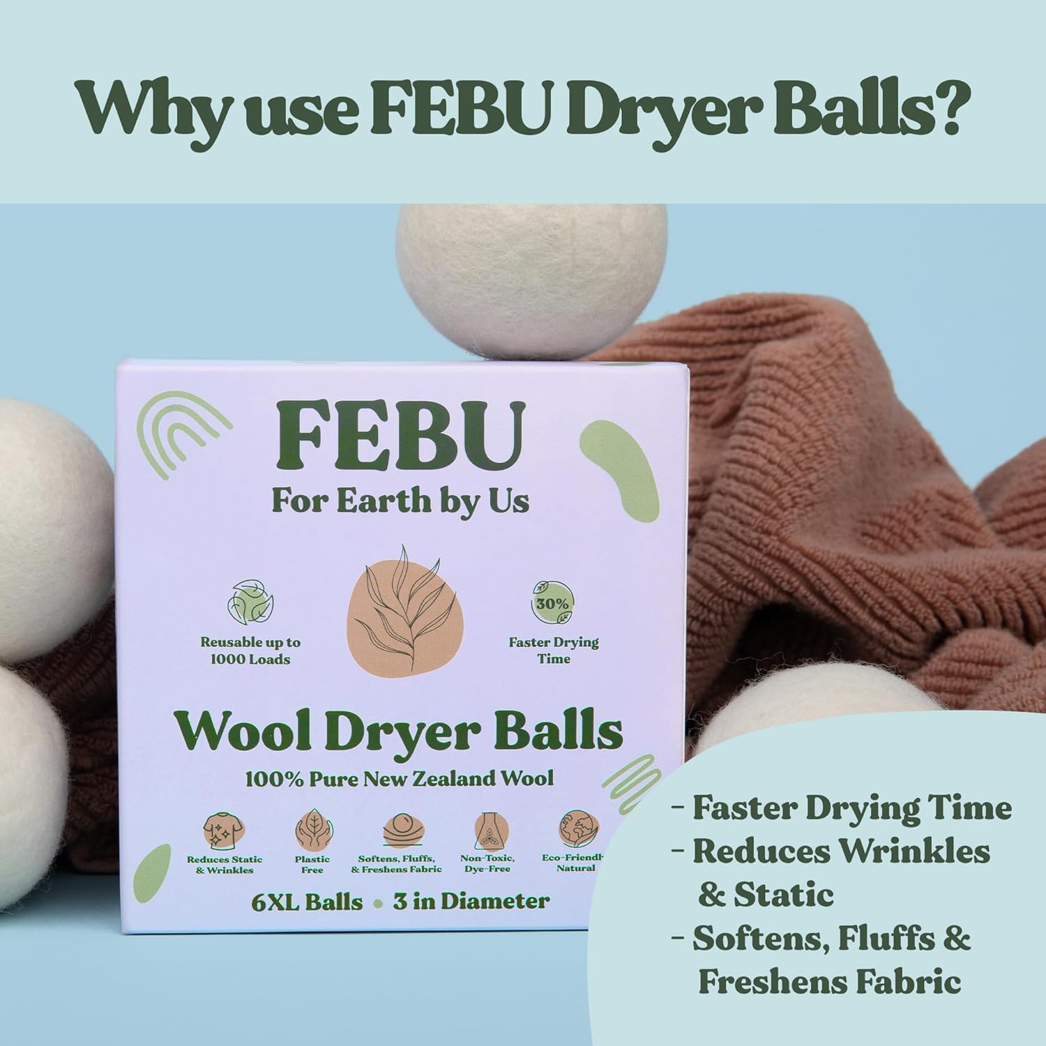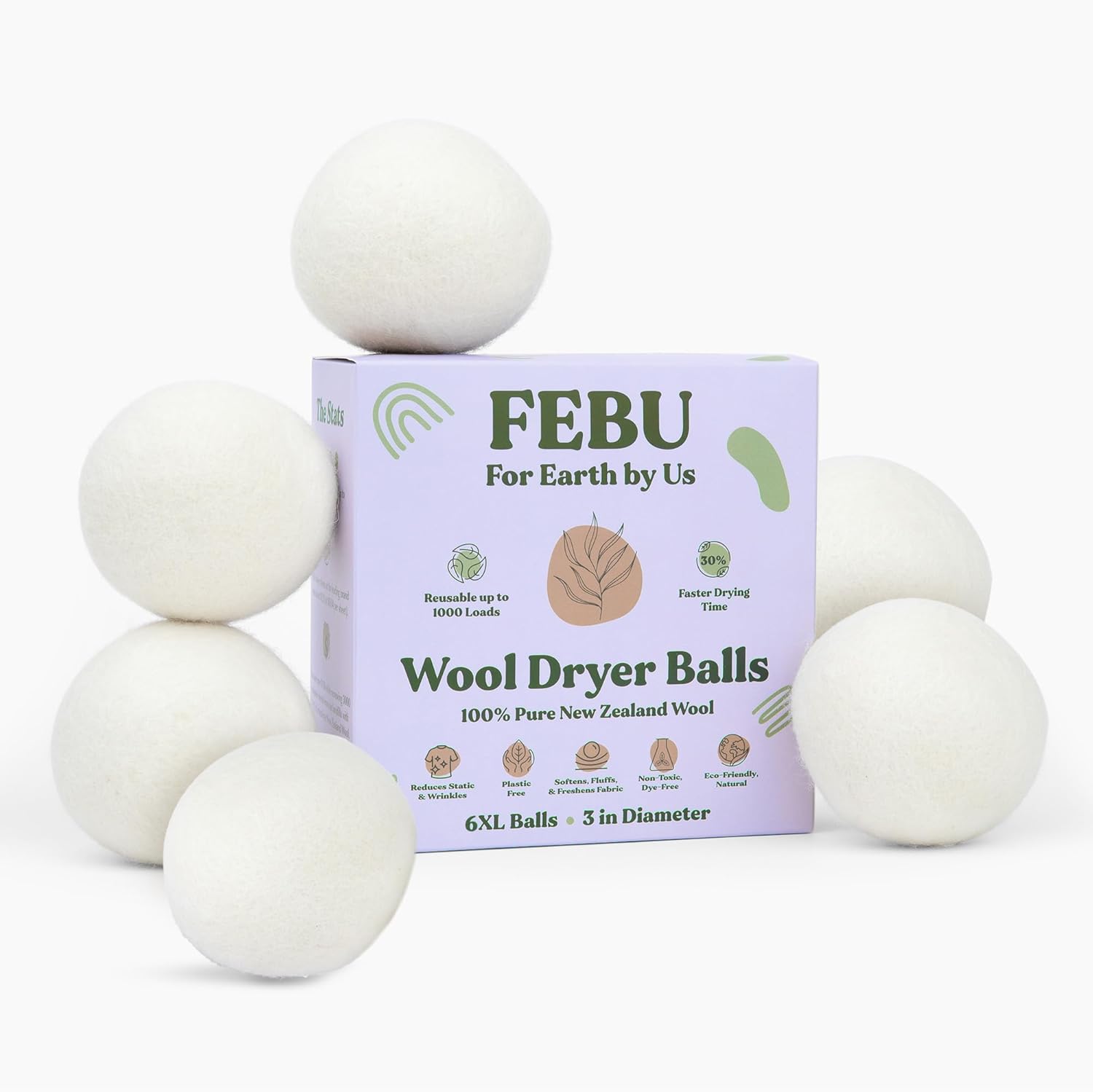 FEBU Wool Dryer Balls, 6-Pack, XL | 100% New Zealand Wool | Natural, Reusable Fabric Softener | Alternative to Dryer Sheets | Reduces Wrinkles, Shortens Drying Time, Zero Waste
