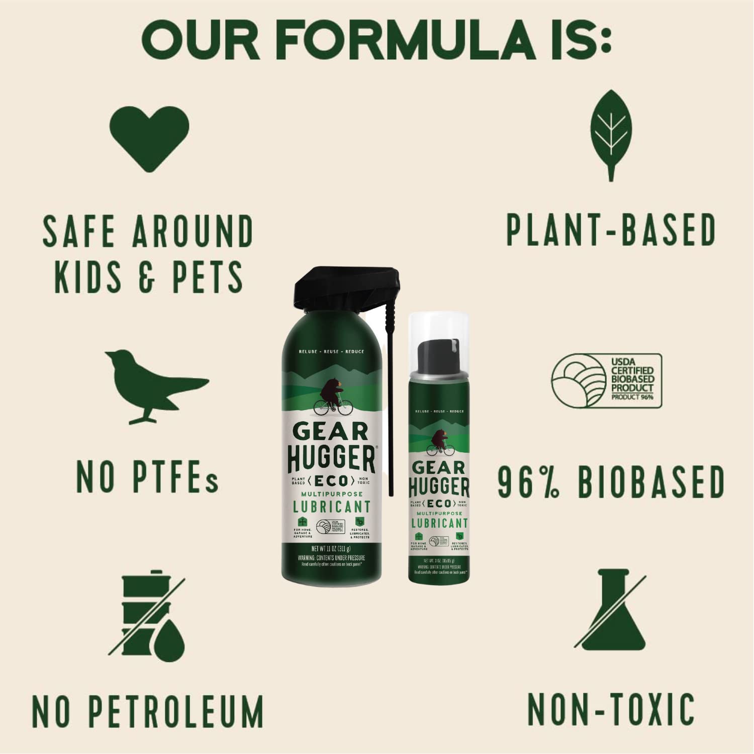 • ENVIRONMENTALLY FRIENDLY LUBRICANT THAT PROTECTS AND RESTORES WITHOUT HARMING OUR PLANET - Make an eco-friendly choice using Gear Hugger to restore, lubricate and protect your gear so it functions optimally, lasts longer and stays out of the landfill. Gear Hugger was created with nature and sustainability in mind. Replace harsh odors, harmful petroleum and PTFE chemicals with our plant-based, non-toxic formula that’s USDA Certified 96% bio-based.