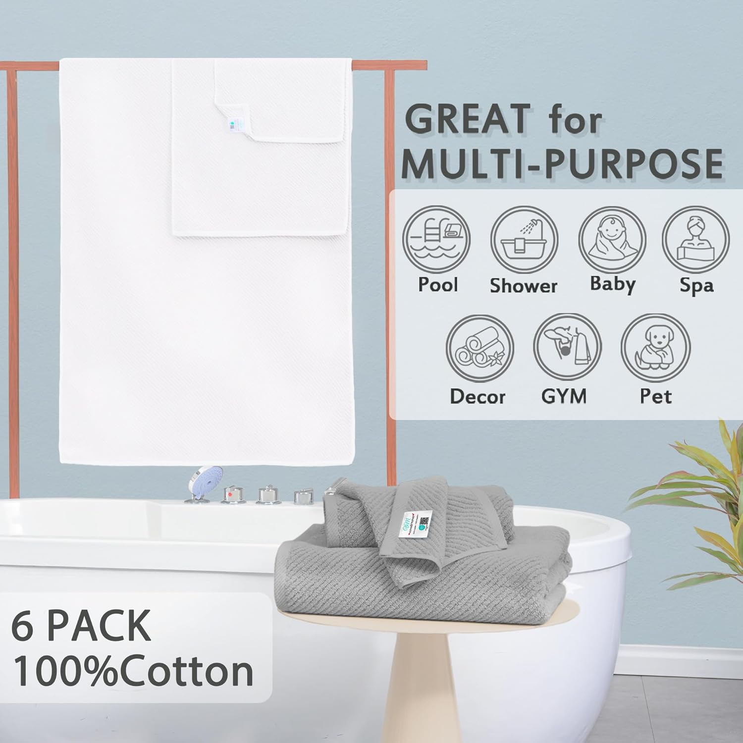 VOOVA & MOVAS Bathroom Towel Set - 100% Cotton | Soft | Quick Dry, Towel Set of 6, 2 Large Bath Towels 30"x56", 2 Hand Towels 18"x28", 2 Washcloths 13"x13", Bathroom Essentials, Grey and White