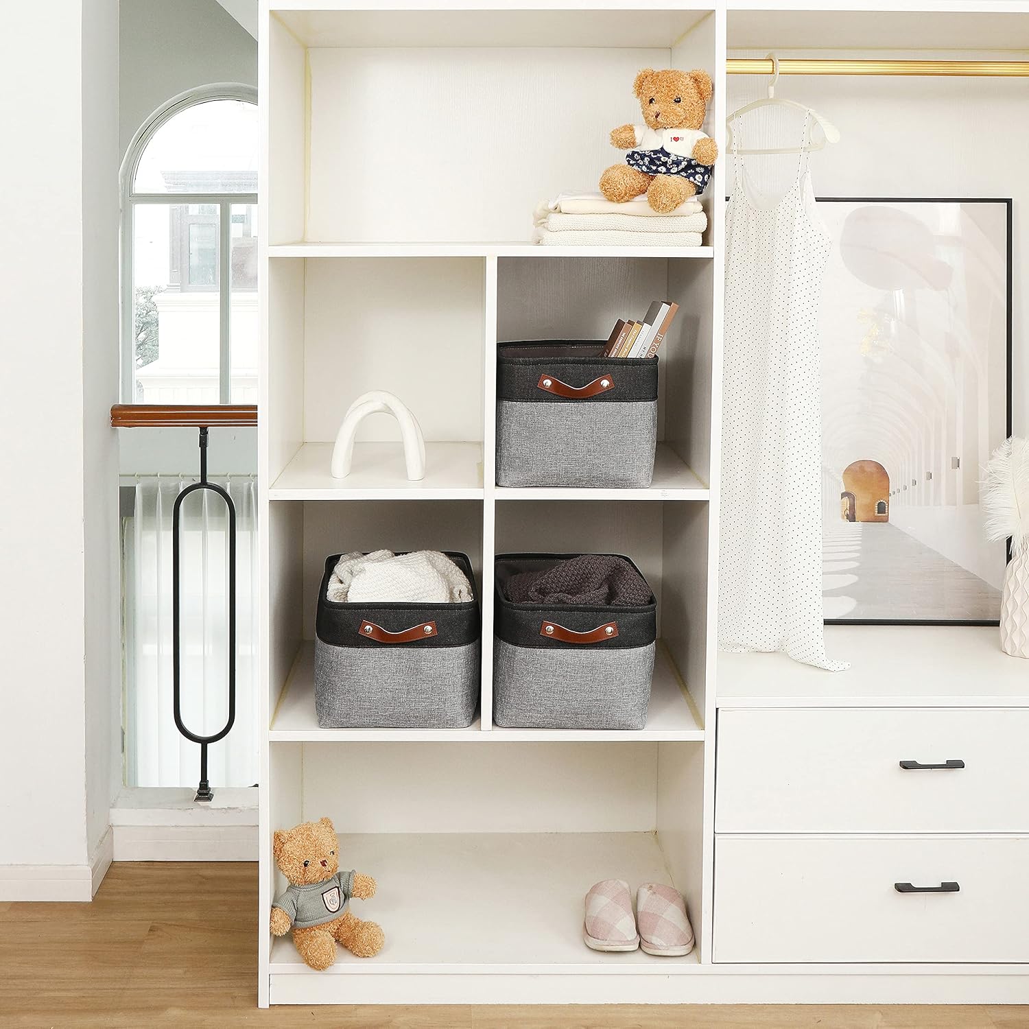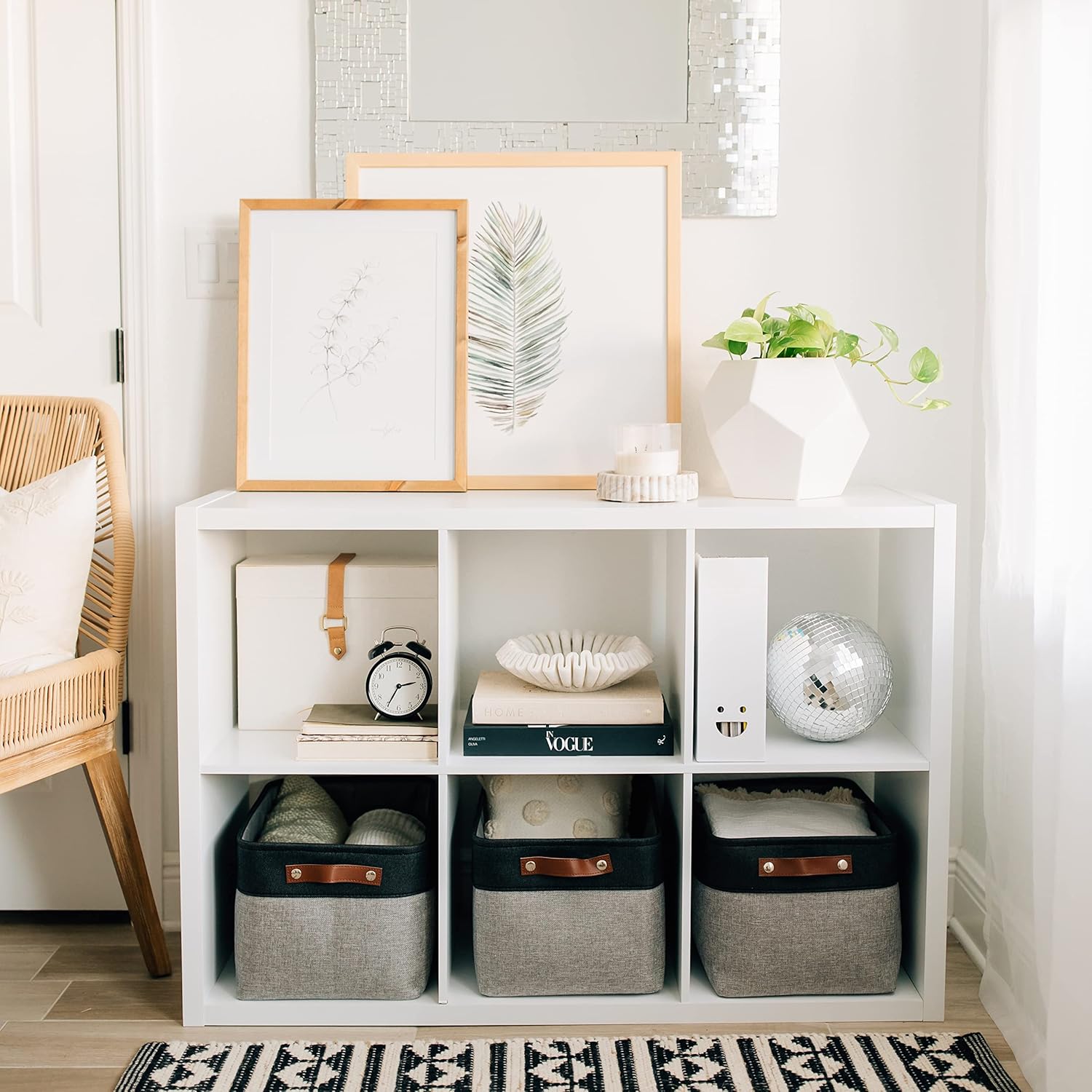• Decorative Fabric and Vegan Leather – These versatile storage baskets for organizing your everyday life are made with a thick, high-quality fabric and fitted with leather handles to add a stylish touch to a living room, bedroom, office, or personal space.