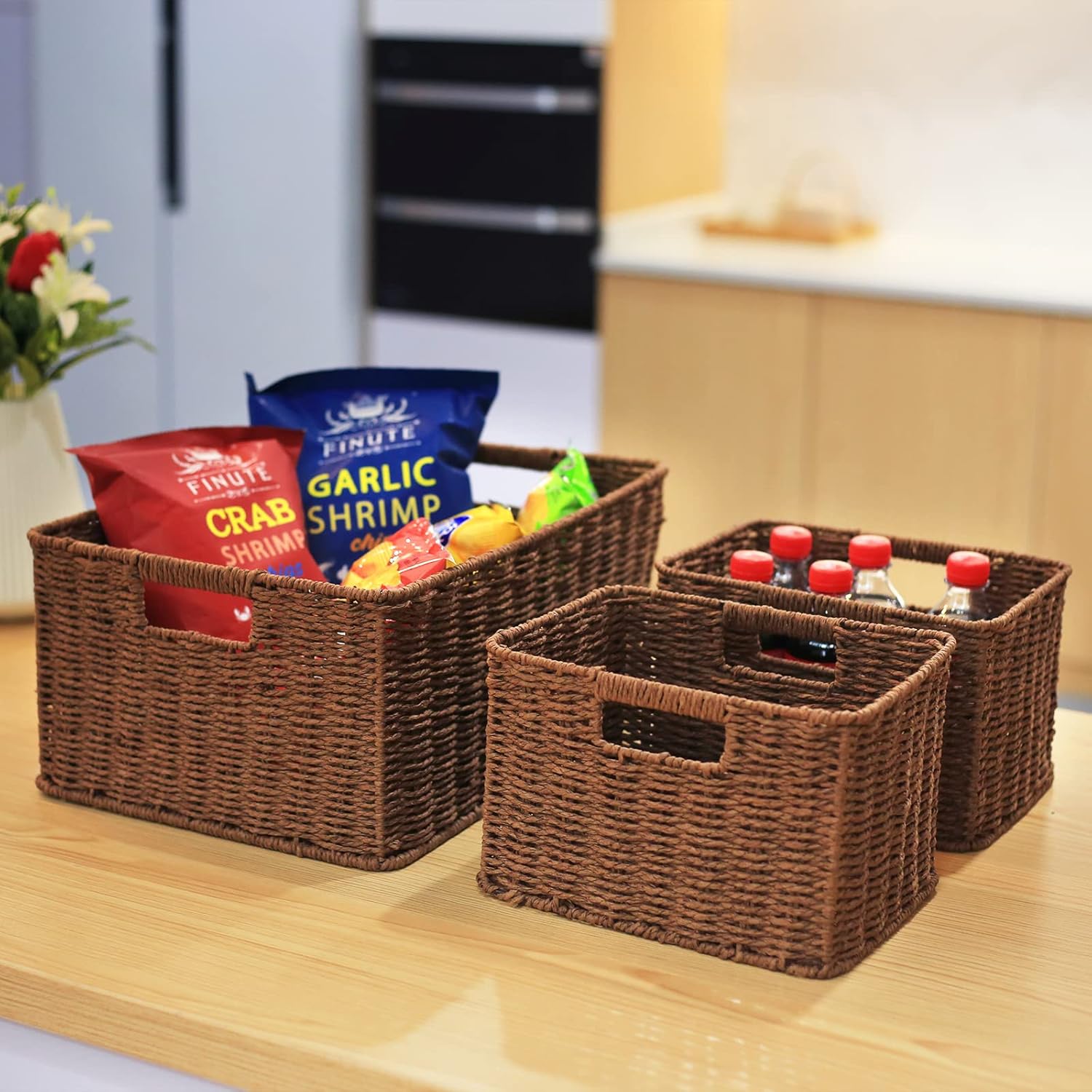 HOONEX Large Woven Baskets for Storage, Paper Rope Baskets with Sturdy Metal Wire Frame, Baskets for Shelves, Set of 3, Dark Brown