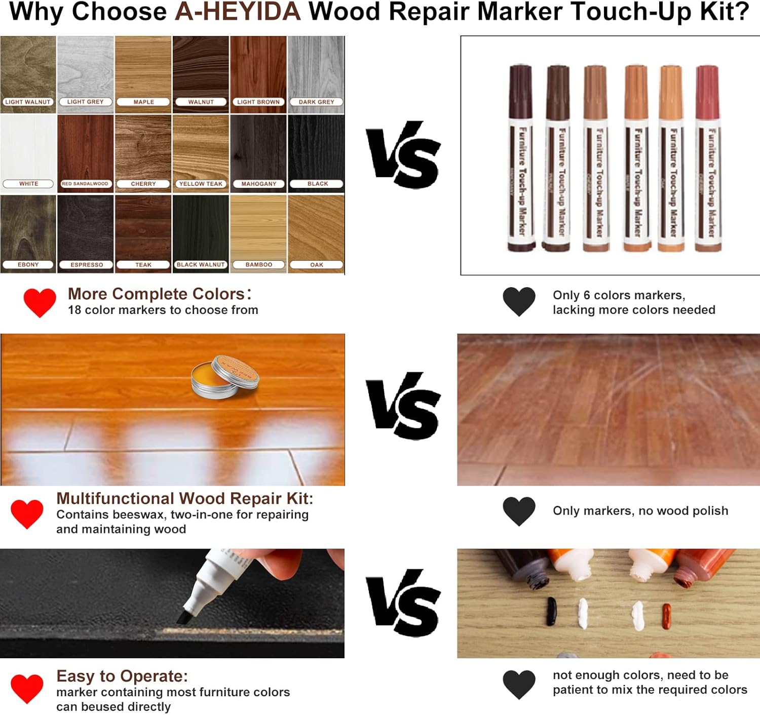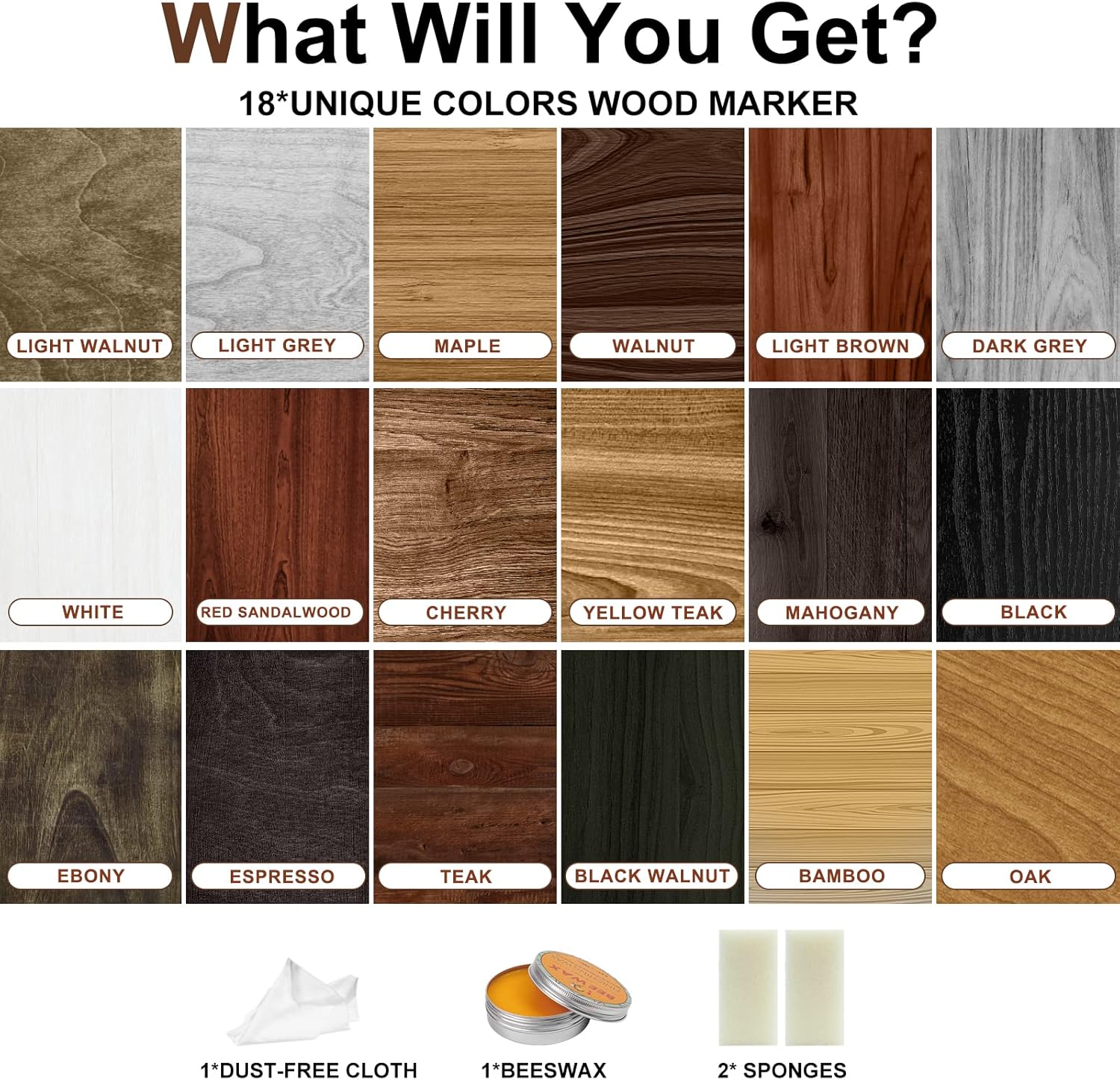 • New Upgraded Wood Marker Touch-Up Kit: This wood repair kit includes 18 colors of wood markers and 50 ml/1.7fl.oz of beeswax. The new wood repair combination kit lets you give new life to old faded wood finishes in your home as you restore scratches, stains, and fading on wood floors and furniture while using the included beeswax to clean and polish the furniture