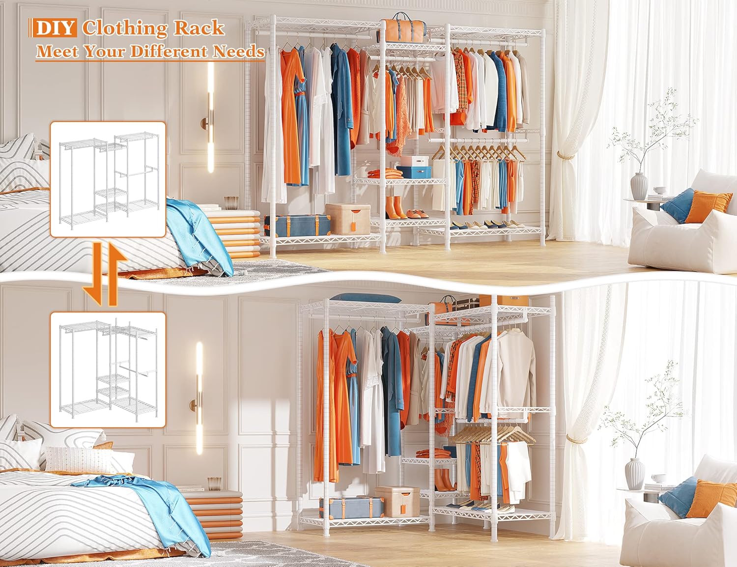 • 【Clothing Rack Load 750LBS Capacity】The clothing rack heavy duty is made of high quality metal poles and 4 hanging rods, each solid metal wire shelf holds 90LBS for a total weight capacity of 750 lbs. The each hanging rod of sturdy clothes rack can hold up to 115LBS.