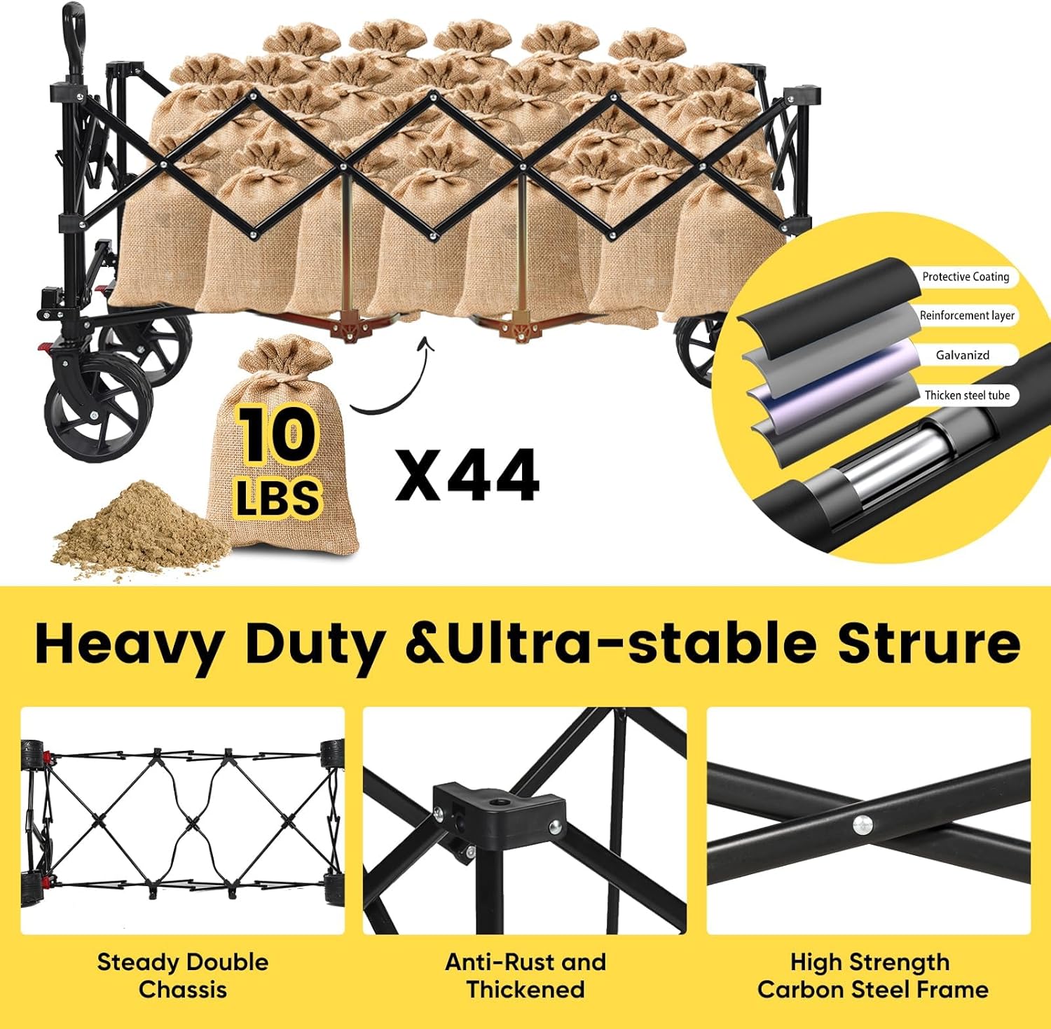 Sekey 48''L Collapsible Foldable Extended Wagon with 440lbs Weight Capacity, Heavy Duty 300L Folding Utility Garden Cart with Big All-Terrain Beach Wheels & Drink Holders. Black