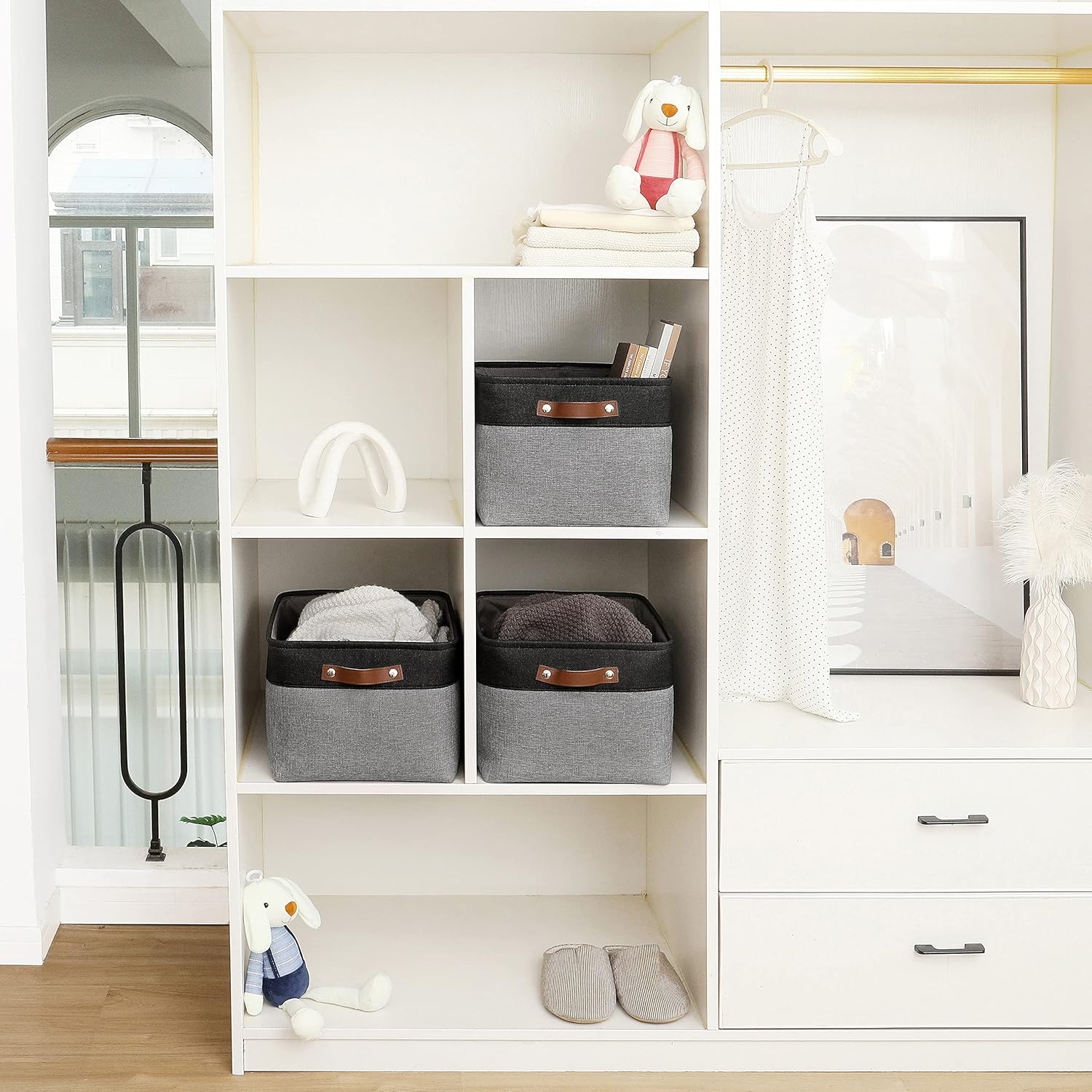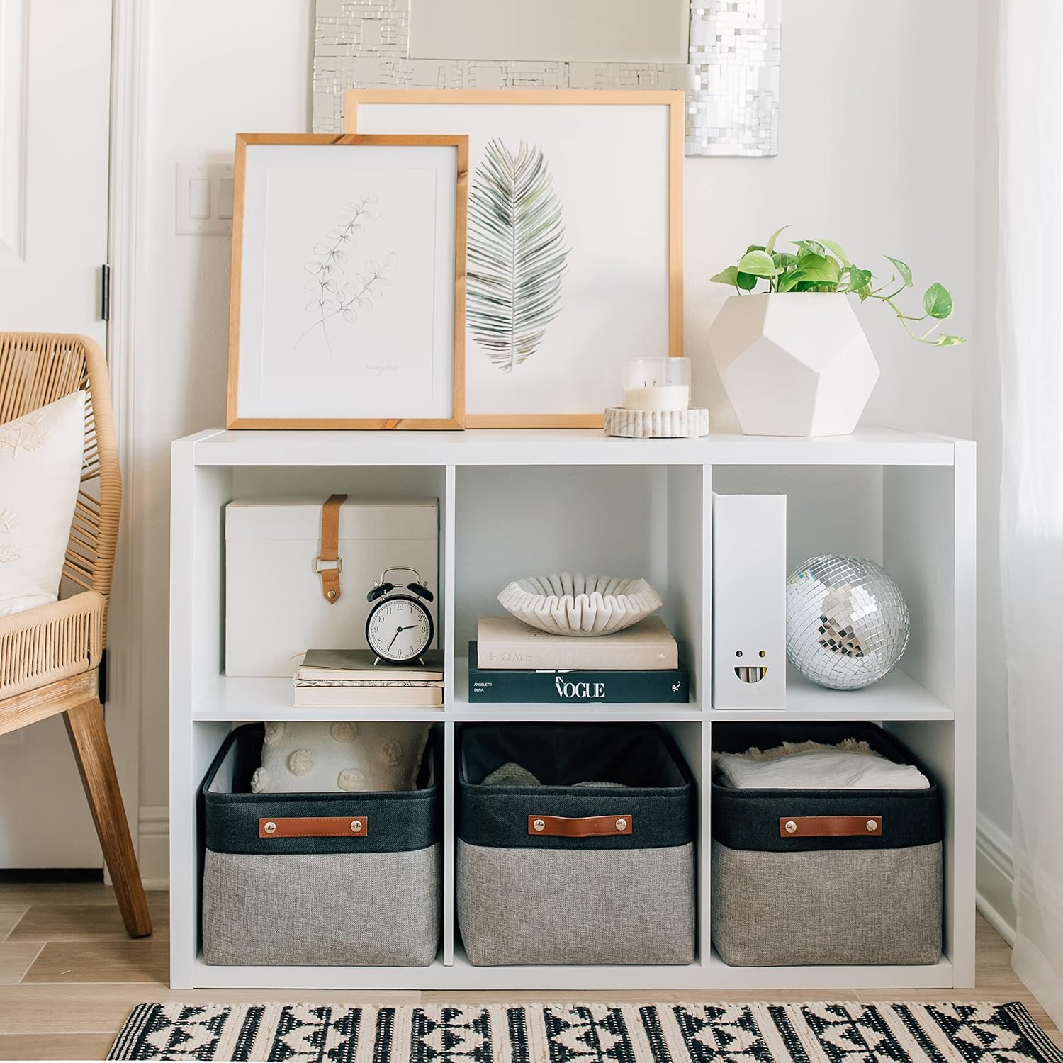 • Decorative Fabric and Vegan Leather – These versatile storage baskets for organizing your everyday life are made with a thick, high-quality fabric and fitted with leather handles to add a stylish touch to a living room, bedroom, office, or personal space.