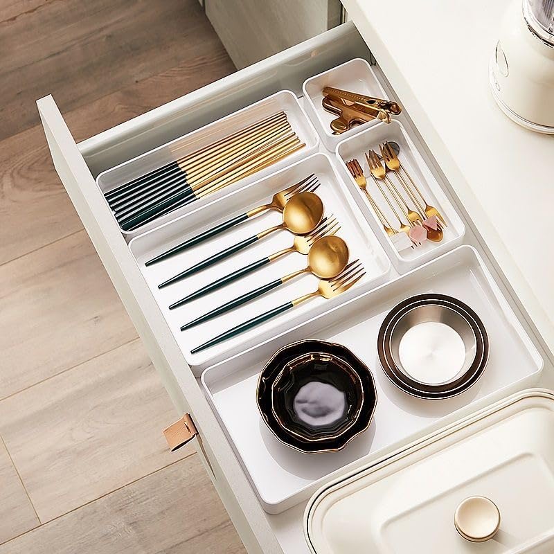 RAUVOLFIA Plastic Stackable Office Desk Drawer Organizers,Multi-size Trays,Small Makeup Vanity Storage Bins and Office Desk Drawer Dividers (White-5 Pack)