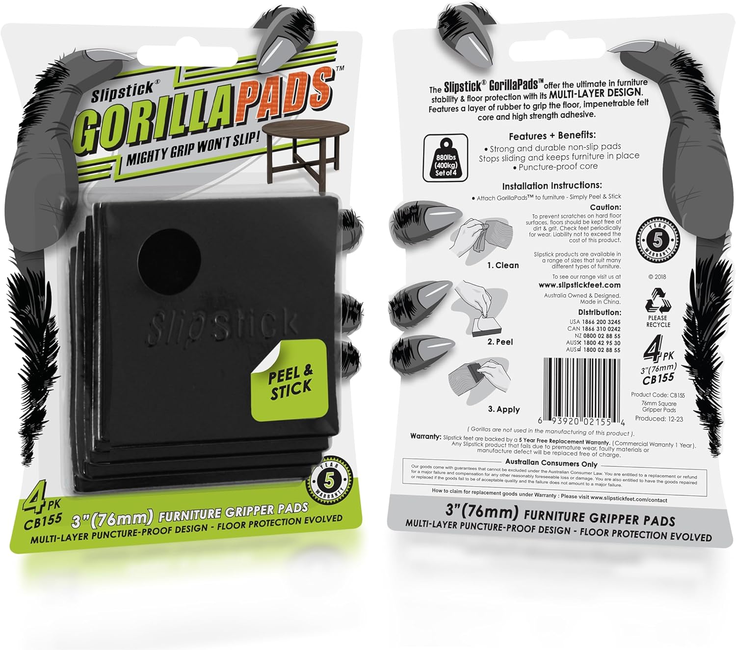• Mighty grip that won’t slip – GorillaPad furniture grips by Slipstick are the universal solution to stop sliding and unwanted movement of furniture / objects and effectively protect all hard surfaces from scratches or damage. Includes 4 x 3 inch square non slip furniture pads.