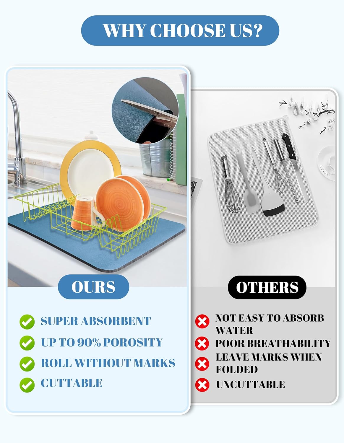 • SUPER ABSORBENT: The microfiber tableware dish drying mat is made of high-absorbent nanomaterials. Special PU surface hide coffee stains, milk stains and any other dark messy stains well. In addition, the drying mat is thick enough to better protect countertops, tableware, and glassware from damage and contamination.