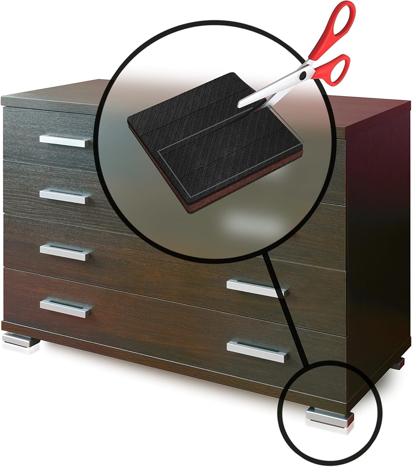 • Prescored to 4 size options – Includes 4 square 4 inch rubber furniture pads that are pre-scored for easy cutting to 1”x4” strips, 2”x4” rectangles, 3”x4” rectangles, or 4”x4” suares. These large non slip furniture pads feature a specially formulated anti slip rubber base layer that provides maximum grip between furniture and floor and have a puncture proof solid felt pad core for durability (covered by 5 year free replacement warranty).