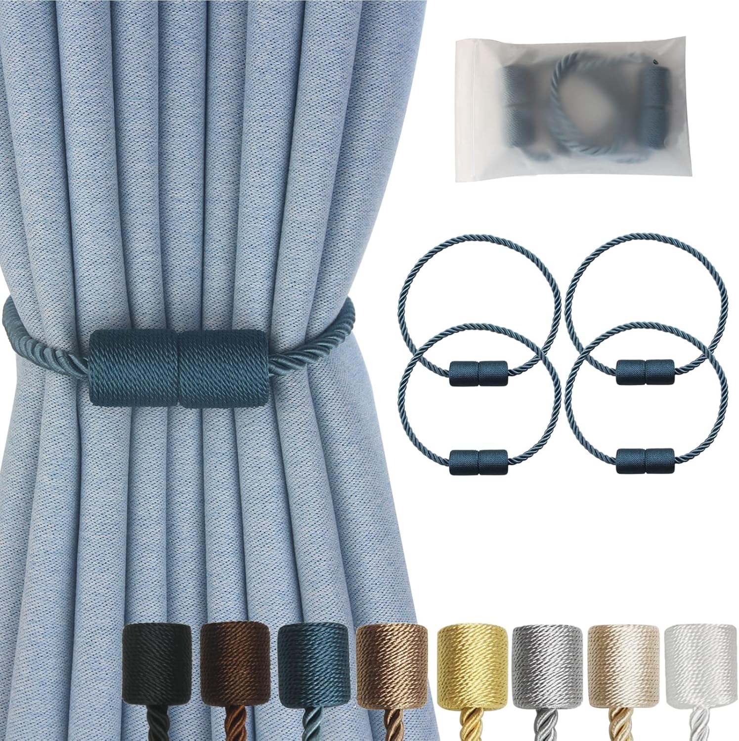 • High-Quality Materials- Magnetic curtain tie backs use an upgraded version of nickel-plated magnets, which are strong and smooth. The brightly colored twisted woven ​texture rope is hand-woven with premium polyester materials. very soft and good feeling. Beige/Gold/Black/White/Grey/Khaki/Coffee/Blue -Eight colors to choose from