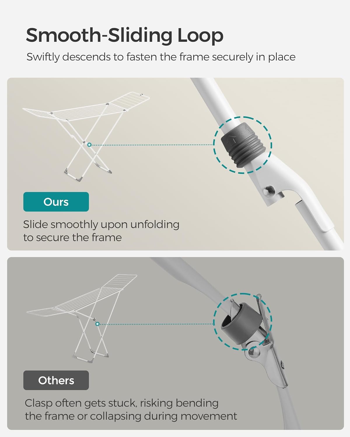• [Thoughtful Details] This drying rack features a smooth-sliding loop, a plastic clip that keeps wings securely in place when folded, and floor-friendly plastic feet